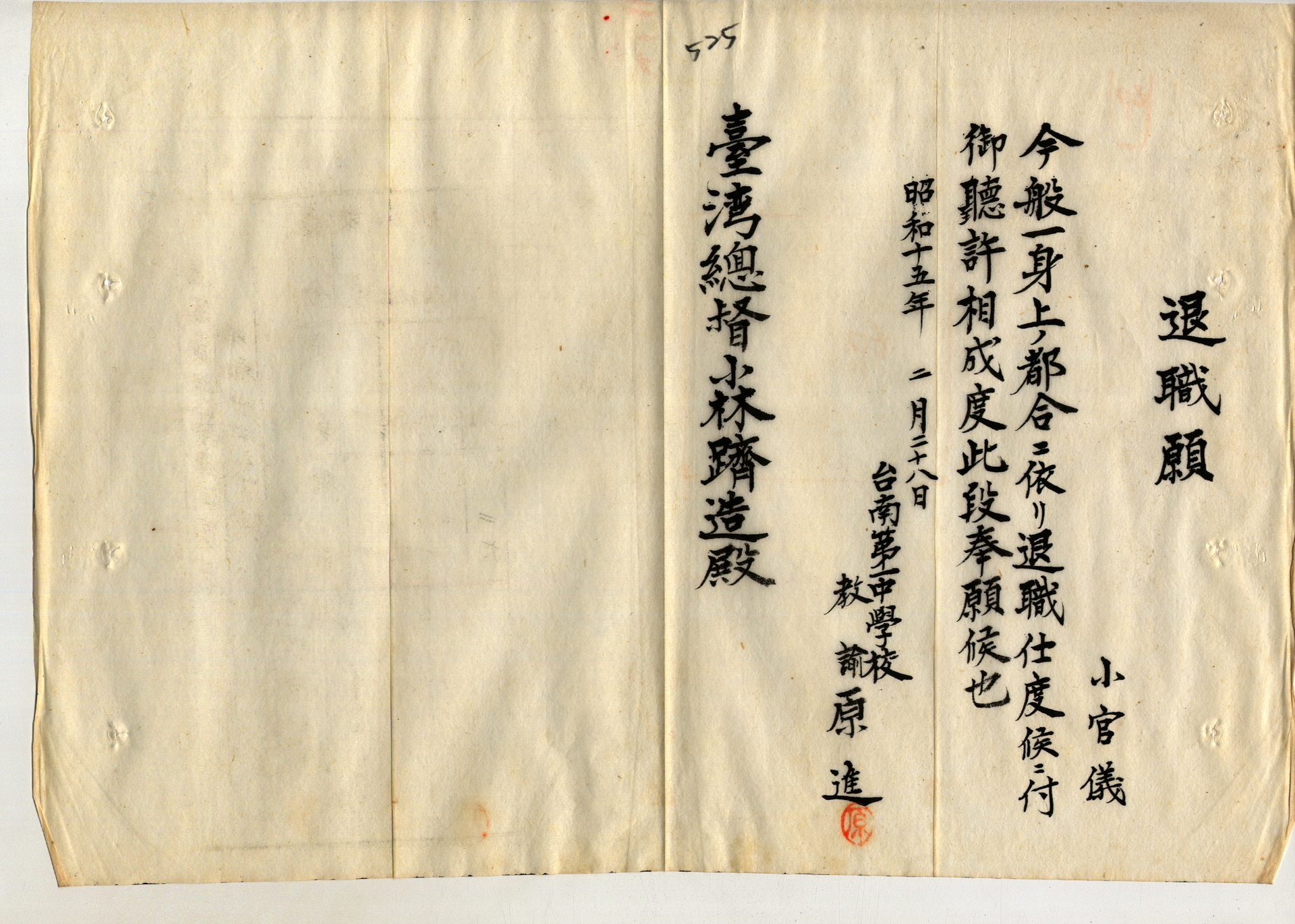 1.〈原進任臺灣公立中學校教諭、敘高等官七等、依願免本官、六級俸下賜、補臺南第一中學校教諭、事務格別勉勵ニ付金千六十圓ヲ賞與ス〉,《臺灣總督府檔案》,國史館臺灣文獻館,典藏號:00010102218。
