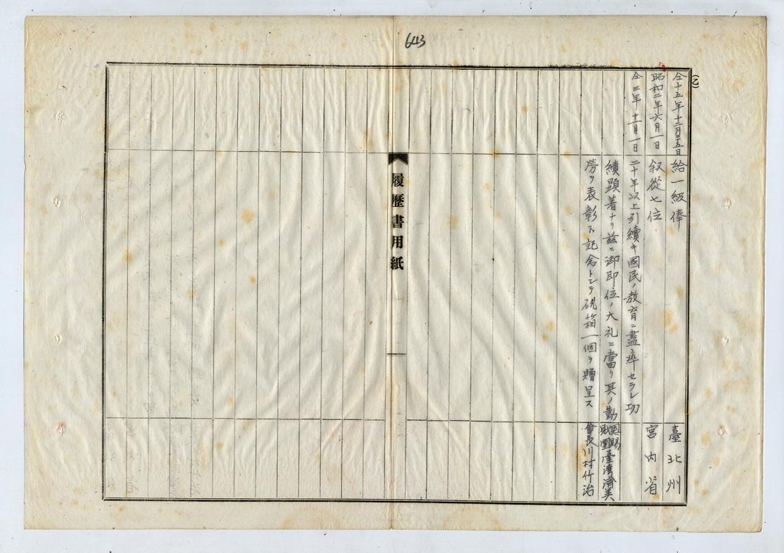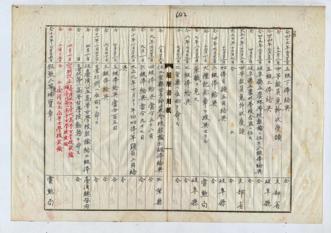 此為清水吉藏的履歷表(應為其親筆),共3頁,目前典藏於國史館,內容除了基本戶籍資料,還詳細記載學經歷,始於明治32年(1899)10月27日,止於昭和3年(1928)11月1日。根據這份履歷表,清水本籍長野,1899年12月任教於岐阜縣揖斐郡小學校尋常科訓導,給八級下俸;隔年5月取得小學校本科正教員執照,除繼續任教於原校(六級下俸),另在10月兼任坂內尋常小學校校長,12月給五級下俸。之後又歷任岐阜縣內的八幡小學校、時小學校,且隨年資有所加給;1910年12月取得中等教員執照後又轉任農林學校教諭,1915年12月獲頒大禮記念章。1920年8月出任三重縣女子師範學校教諭,1922年1月30日再赴臺灣,任臺北第一高等女學校(今北一女)教諭。1924年7月敘勳八等、授瑞寶章,1926年給一級俸,隔年敘從七位;1928年因從事教職20年以上而獲得臺灣濟美會所頒贈的硯箱作為表揚。據總督府其它公文所載,清水於1929年因神經衰弱症辭職,不過在總督府職員錄上仍載其為第一高女囑託至1937年。