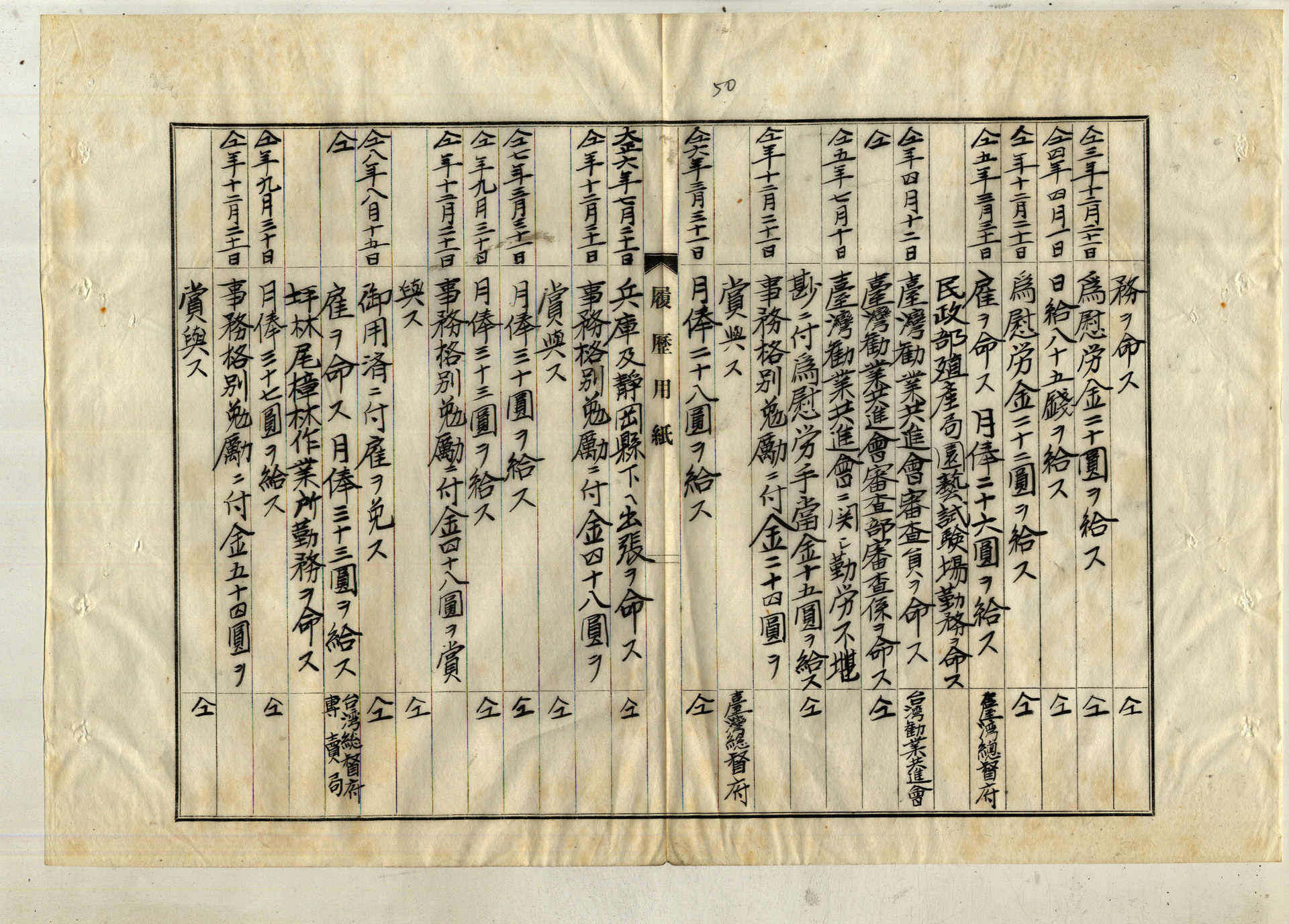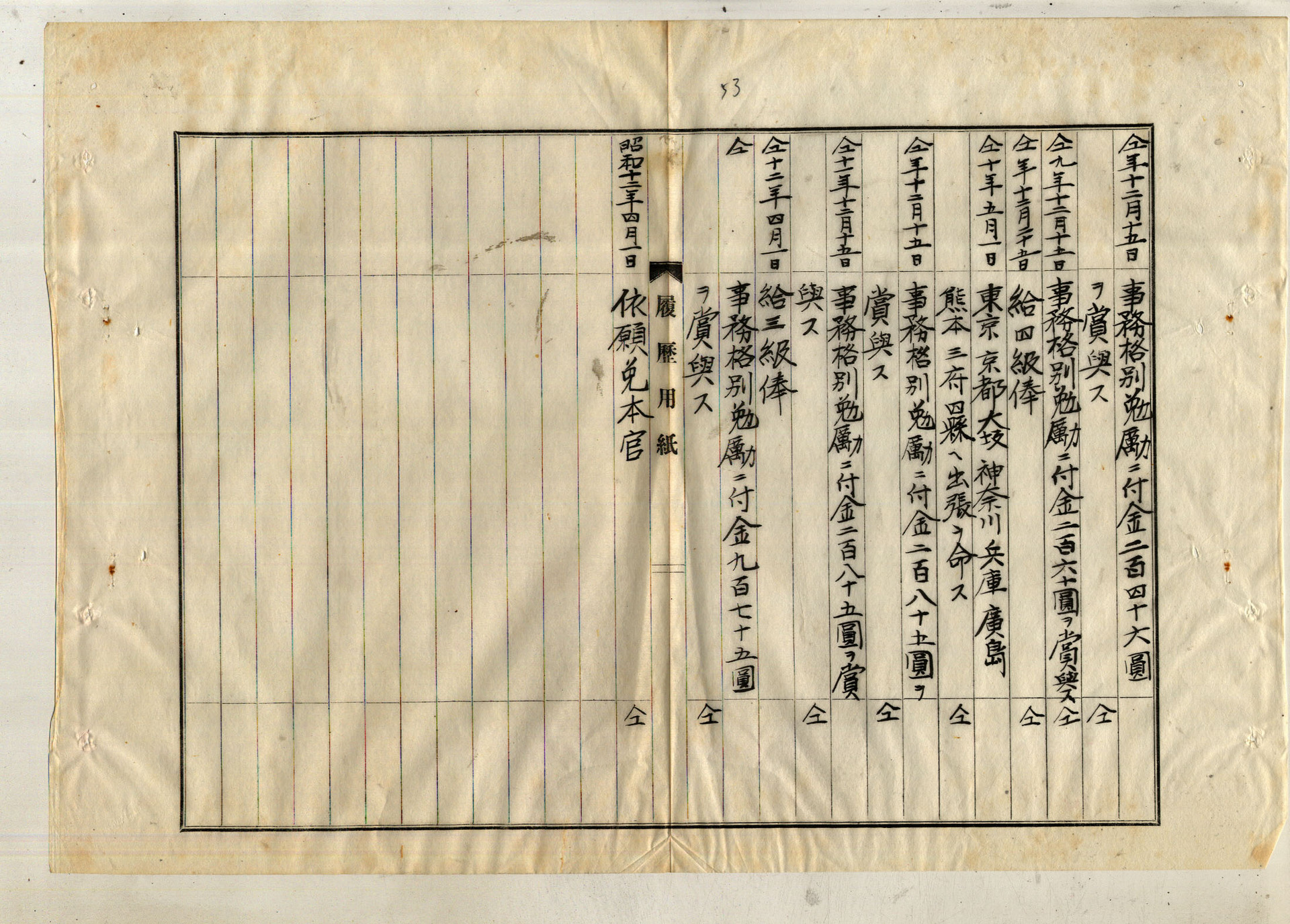 此為祝彥熊的履歷表(應為其親筆),共5頁,目前典藏於國史館,內容除了基本戶籍資料,還詳細記載學經歷,始於明治41年(1908)4月5日,止於昭和12年(1937)4月1日。根據這份履歷表,祝彥熊本籍鹿兒島,1911年4月畢業於縣立大島農學校,同年5月任職於鹿兒島高等農林學校,負責園藝學教室相關勤務,給日薪25錢,並有職務勉勵賞金。1912年5月,工作內容改為承辦物品出納事務;1913年11月4日,祝彥熊辭去學校職務,隨後在10日渡臺,任殖產局園藝試驗場傭員,日薪80-85錢,且於年底領有慰勞金20-22圓不等。1916年3月轉為職階較高的雇,月薪26圓;4月受命任臺灣勸業共進會審查員,會後獲得慰勞津貼15圓。1919年8月轉任於專賣局的坪林尾樟林作業所,之後又歷任菸草課、酒課。1922年6月任專賣局書記(九級俸),往後薪俸隨資歷調升,至1937年4月已領有三級俸,祝彥熊則於此時因病辭職;除年俸外,另有事務格別勉勵金150-975圓。