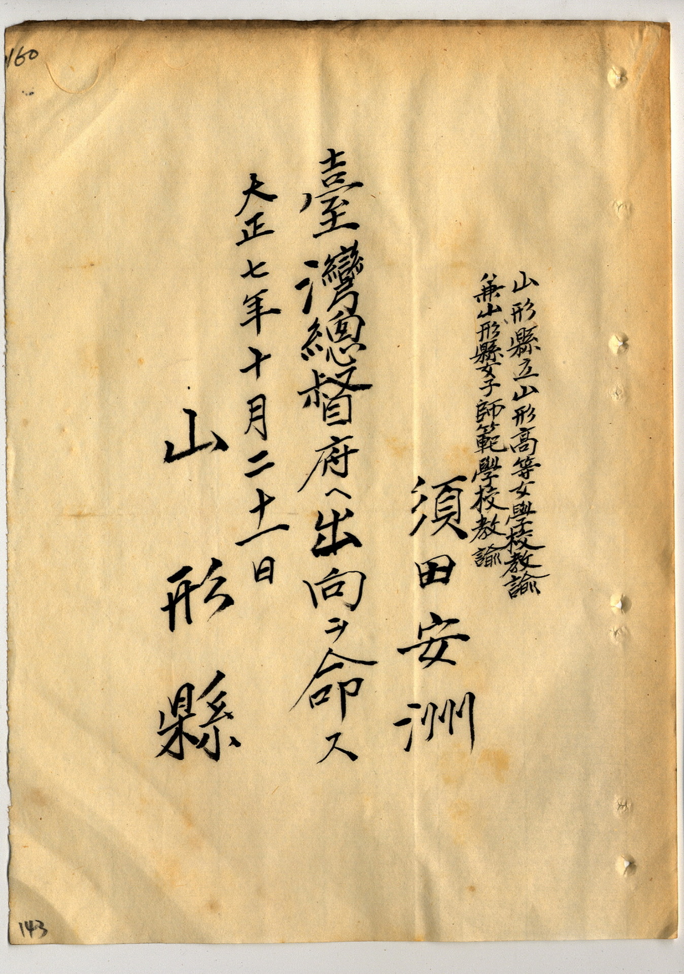 1.〈山形縣立高等女學校教諭兼山形縣立女子師範學校教諭須田安洲(任府高等女學校教諭)〉,《臺灣總督府檔案》,國史館臺灣文獻館,典藏號:00002894033。
