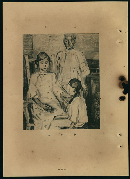 此為陳植棋以無鑑查(免審查)出品昭和3年(1928)第2回臺展西洋畫部的畫作。臺展自第2回起規定,前一年特選者翌年可以無鑑查資格出品,而陳植棋去年是以《海邊》一作榮獲特選。此作描繪3名女子,似為母女關係,位於畫面左邊的梳髻的婦人身穿臺灣長衫,面朝右,倚坐在靠椅上,雙手微微張開,右手垂放腿上,看著坐在面前的雙辮女孩。女孩與之相對而坐,但頭微低,並未與婦人相視。椅後站著短髮或束髮的少女,左手扶著背後的櫃子,面向觀者,其格子紋短袖的臺灣長衫描寫,亦出現在畫家同年的另一幅臺展出品作《二人》中,模特兒有可能是同一人。3人的視線及構圖,從少女至婦人、女孩,呈現自上而下的視覺導引效果。該年《臺灣日日新報》漢文版記者評:「陳植棋氏《三人》《二人》。雖追近槐樹社派。而依然不失其帶有未來派氣分」。槐樹社成立於大正13年(1924),為帝展的外圍組織,引進野獸派和立體派風格,並將之日本化。陳植棋自1926年起每年入選槐樹社展,其動感筆觸與簡化風格的確接近該派,但有日本未來派「氣分」的說法,可能只是對其較具前衛感的一種讚辭。