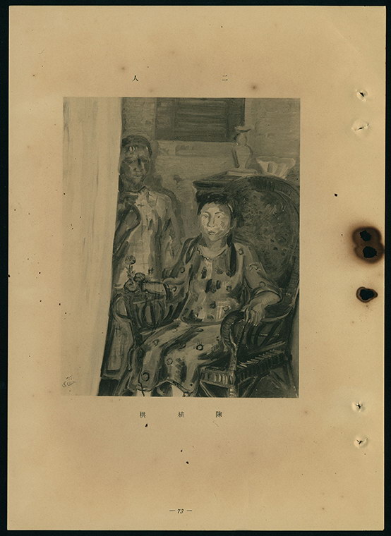 此為陳植棋以無鑑查(免審查)出品昭和3年(1928)第2回臺展西洋畫部的畫作。臺展自第2回起規定,前一年特選者翌年可以無鑑查資格出品,而陳植棋去年是以《海邊》一作榮獲特選。此畫描寫2名女子,似為姊妹關係,編雙辮的妹妹身穿花紋洋裝,左手持有一枝花,坐在籐椅上,但因體型嬌小,只坐在椅子的前半部。姊姊站在椅子右側,身體右半邊被布簾微微遮住,一手舉起靠胸,穿著淺色格子紋短袖的臺灣長衫,在畫家同年的另一幅臺展出品作《三人》中,亦有身穿相同款式的女子,模特兒可能是同一人。此外,藤椅後方有一深色的櫃子,上面放有燭臺與花口盤,這兩件器物也出現在同是同年臺展出品作的《桌上靜物》中,可見畫家習以相同題材入畫。該年《臺灣日日新報》漢文版記者評:「陳植棋氏《三人》《二人》。雖追近槐樹社派。而依然不失其帶有未來派氣分」。此處的「未來派」,是指日本的未來派,即成立於大正9年(1920)的未來派美術協會、以普門曉為代表的前衛美術運動。臺日報亦以此詞稱呼具前衛色彩的美術家活動,如東鄉青兒,故未來派一詞在此比較像是用於指稱陳植棋作品帶有前衛色彩,而非風格上的相仿。