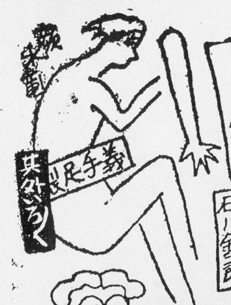臺灣日日新報設有一個「臺日漫畫」專欄,於臺展期間可見針對入選作品之戲筆,詼諧幽默、令人莞爾,作者多半是該報社的漫畫記者國島水馬。此幅漫畫亦是出自水馬之手,調侃的對象是顏水龍的《斜靠椅背的裸女》(1929)。原畫描繪一名裸體的女性,斜坐在一圓形靠背的椅子上,左手搭著椅背,與舉起的右手交疊,頭部則枕於手臂上,呈現出閉目養神的悠閒神態。水馬在漫畫裡挪用了畫中女子的姿勢,但原本憑靠椅背的左手臂卻與身體分離,獨立成一體。此外,這則漫畫還有標題「義手足製」並補充「另有很多」,意指女子的斷臂實為義肢,且款式多樣可供選擇。原畫之所以遭到如此揶揄,應是針對裸女的手臂筆直而僵硬的狀態,彷彿是另外添加上的義肢,展現出水馬對於人物形體不自然的情況,有著直白而風趣的嘲弄。