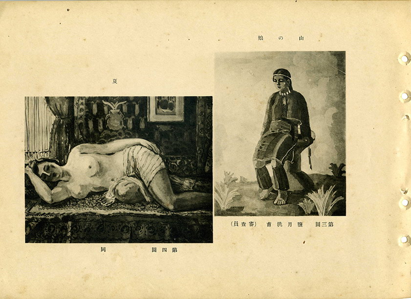 左圖為審查員鹽月桃甫出品昭和2年(1927)第1回臺展西洋畫部的油畫。畫面中一名裸婦側身躺在紋飾華麗的布床上,臉部正面迎向觀者,頭則靠著枕頭,右手臂向上舉倚著頭部,左手則順著身體的曲線平放在大腿旁,下半身有橫條紋的流蘇布幔遮掩陰部。背景亦是裝飾複雜的掛毯,右上角掛有一件小幅畫作,整個空間顯然經過精心裝飾。掛毯旁的窗戶隔著窗簾透出些許的陽光,正好從畫作的左側灑落在裸婦身上。現存有一張1927年攝於鹽月畫室的黑白照片,此畫放在畫架上出現在照片右側,與室內其他物品相比,可見其尺寸之龐大,此外,從照片左側窗邊垂掛下來的布幔以及掛在上面的小畫作,可知此畫的取景便是在此。大澤貞吉(鷗亭生)評曰:「此畫家特色是以偏淡紅色的輕柔色調,製造出一種渾然天成的氛圍。這個特色在此作中也很明顯,雖然女子右手姿勢有點不合理,但是就整體而言,是件畫面融洽的有趣之作」。西岡塘翠則認為此畫的色調欠佳:「這幅畫總覺得在其美艷中透著一股妖氣。背景的色調不佳、太暗,裸女的肌膚顏色及臉頰的紅暈,也需再斟酌」。雖然兩人的意見分歧,卻非常有助於我們想像此畫的用色。