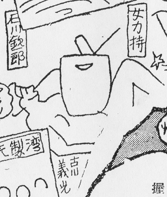 臺灣日日新報設有一個「臺日漫畫」專欄,於臺展期間可見針對入選作品之戲筆,詼諧幽默、令人莞爾,作者多半是該報社的漫畫記者國島水馬。此幅漫畫亦是出自水馬之手,調侃的對象是古川義光的《畫室裸婦》(1929)。原畫描繪一名裸體女子躺臥在墊有大塊白布與花布的平臺上,身旁垂掛著布幔、牆上亦有靜物畫作為裝飾,營造出畫室的空間陳設與氛圍。在水馬的漫畫裡,則僅擷取出裸婦的形象,但在其腹部上添加了大型且難以辨別的量體,疑似是石臼或巨石塊。這則漫畫的標題「女力持」為女力士之意,用以指稱由女子徒手舉起重物的一種街頭雜技。水馬之所以將畫室的裸體模特兒比喻成大力士,或許是針對原畫中女性較為壯碩的身軀,彷彿有著足以舉重的力氣;此外,古川以粗黑的線條勾勒出女子身體部份的輪廓線,也有增加人物量感的效果,再加上水馬的揶揄,使得畫作頓失不少雍容優雅的氣質。