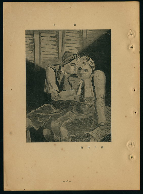 此為審查員鹽月桃甫出品昭和8年(1933)第7回臺展西洋畫部的作品,此作主要運用幾何形大色塊組合構圖,描繪兩位正在親密私語的原住民女孩,兩人併肩而坐,身體緊靠,幾乎合而為一,左邊女孩的臉湊在同伴的耳邊低語,並伸出右手掌作出某種手勢。畫中室內光影效果強烈,背景漆黑,惟上方受光照一隅可見類似木板牆之物。王淑津(2009)指出,此畫運用誇張的手勢與動作表現人物對話的手法,可能是受畢卡索(Pablo Ruiz Picasso, 1881-1973)或布拉克(Georges Braque, 1882-1963)兩位畫家的啟發。當時藝評認為此作如一篇抒情詩,亦即充滿豐富情感之表現,臺北一記者評曰:「兩位蕃地少女很親密地竊竊私語。描繪出少女的純真與蕃布之美。鹽月的作品往往富有詩意,而這幅《女孩們》正宛如一篇抒情詩」。不過也有人尖銳批評其人體結構的錯誤,錦鴻生(林錦鴻)評曰:「意在黒色和紅色的對比效果,一目瞭然。此外,畫面下方的黄色醒目,形成有趣的對照。然而使用黒色的斜線,嚴重破壞畫面的詩意。此畫中最為礙眼的是,右邊的女孩欠缺素描之力。例如腳的描寫,但肩膀特別糟糕,骨格沒長出來」。