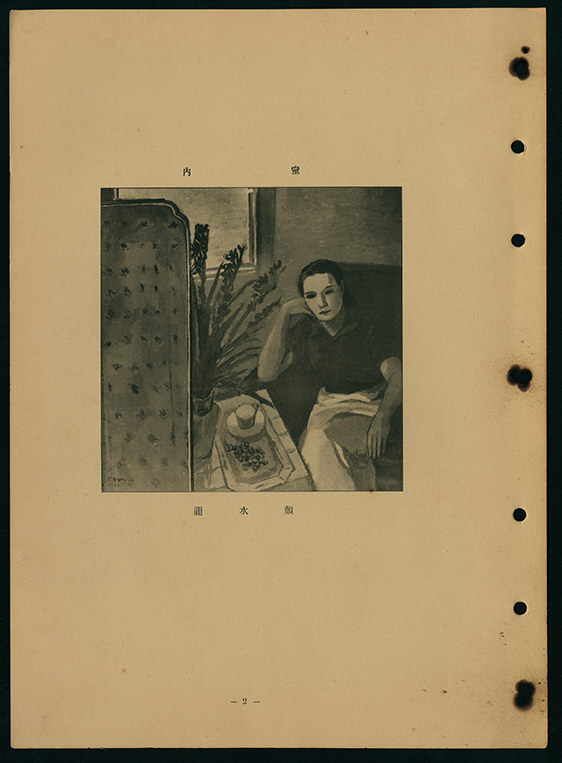此為審查員顏水龍出品昭和9年(1934)第8回臺展西洋畫部的畫作。此畫現雖缺乏彩色圖版,然《臺灣教育》署名「青山茂」者觀展撰寫的文章有略述此畫的用色:「今年擔任審査員的顔水龍出品《室内》和《姫百合》兩件。前者描寫咖啡廳一隅。穿朱紅色上衣的婦人背倚藍色窗戶,窗前桌上擺有咖啡杯,前景的左邊可以看到黄色的屏風」,加上桌上的盆栽種植著高聳盛開的蘭花,讓畫面的色彩顯得豐富而多樣。婦人姿態優雅,靠在沙發上顯得若有所思。左下角為畫家落款「T.gam」。此畫當時陳列在西洋畫部第7展覽室。《臺灣日日新報》記者野村幸一評曰:「顔水龍身為審査員,果然作品有審査員的水準。只是出品兩種不同風格的畫作,值得深思,因為感覺像在穿兩雙草鞋,很不舒服。《室内》這幅,那個黄色屏風不要放那麼前面就好,再多要求一點的話,女人坐著的沙發,若能以更強烈的色調描寫的話,更佳」,畫家若以兩種不同的畫風參展,導致其個人風格缺乏統一性,使評者較無所適從。構圖方面,野村認為屏風的位置應當調整,顯然覺得婦人所在的右側空間由於屏風的關係,變得太過壓抑擁擠所致。然野村仍認為「果然作品有審査員的水準」,肯定這位首次成為臺展審查員的臺籍畫家的實力。