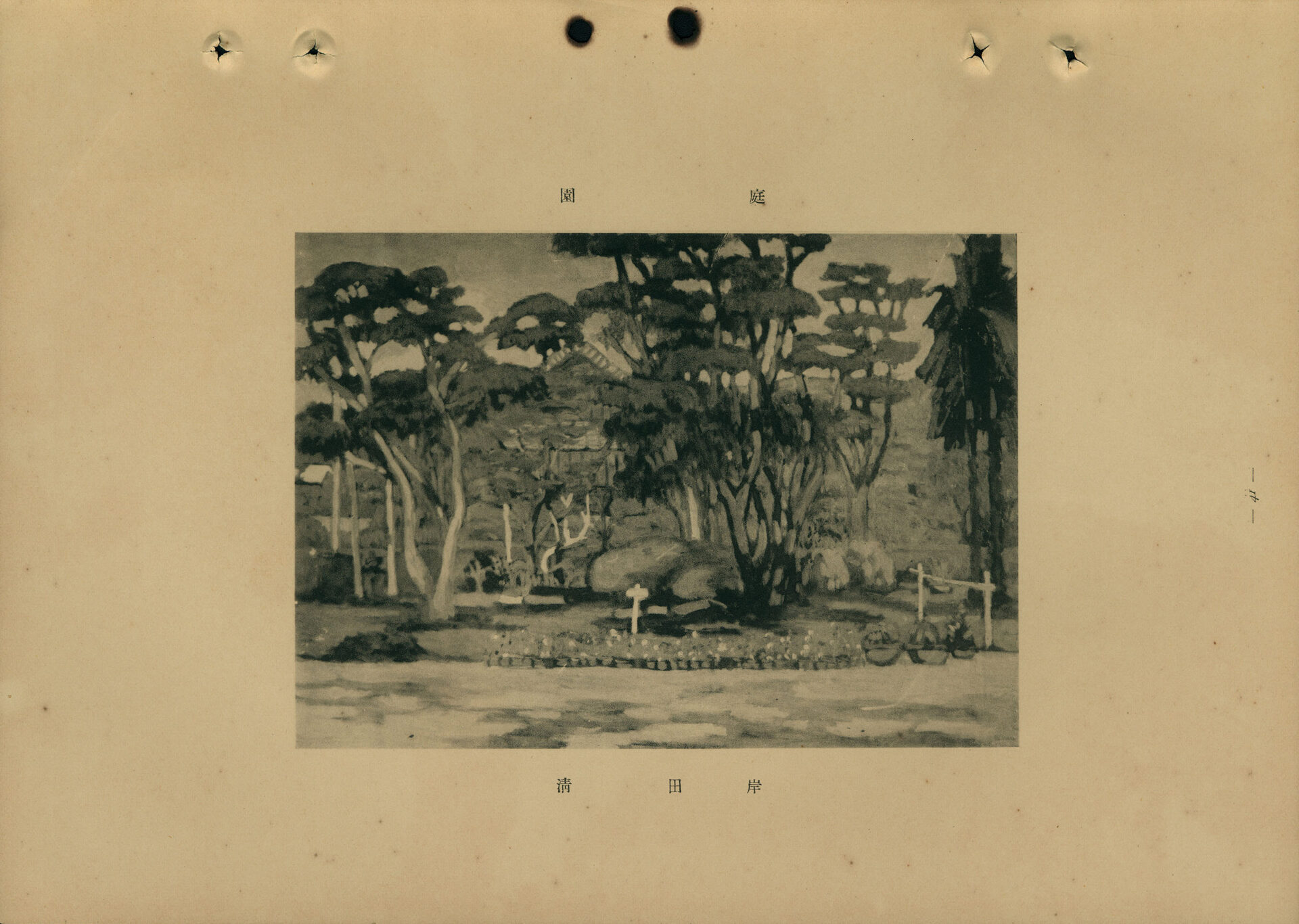 此為岸田清入選1929年(昭和4年)第三回臺展西洋畫部的畫作,描繪一處日式庭園,樹木綠蔭蔽天,草木繁茂,花圃裡有點點白花,營造欣欣向榮的景象。在強烈的光照下,樹影落於花圃及樹幹上。一棟房屋隱身在庭園樹木的後方,從外觀來看可能是日式的木造房舍。1929年11月13日《臺灣日日新報》(夕刊2版)的臺展入選報導,標記:「庭園 岸田清」。1929年12月1日《臺灣教育》第329號〈第三回臺展の盛況〉,標記:「庭園 基隆 岸田清 380」,意即此畫售價訂為380日圓。