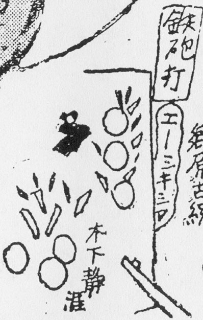 臺灣日日新報設有一個「臺日漫畫」專欄,於臺展期間可見針對入選作品之戲筆,詼諧幽默、令人莞爾,作者多半是該報社的漫畫記者國島水馬。此幅漫畫亦是出自水馬之手,調侃的對象是木下靜涯的《秋晴》(1929)。原畫描繪一顆結石纍纍的梨子樹,枝葉交錯繁茂,其中位於畫面上端的細枝,還停有一隻毛色較深的鳥,成為全畫焦點。水馬在漫畫裡概略地表現茂盛的梨子樹,僅畫上幾顆圓型的球狀物與數片葉子以作示意;而畫中原為停留駐足的鳥,則呈現出如展翅飛於半空的樣貌。這則漫畫的標題被定為「鐵砲打」(放槍),「鐵砲」為江戶時代以前對槍炮的稱呼,在漫畫框格外也確實畫了根槍管,瞄準框內的圖像。水馬將《秋晴》比喻為射槍的場面,或許是認為畫中的梨子宛如射擊的標靶,而那隻鳥則是最終被捕獵的目標,因而以揮動翅膀的形象暗示其為驚弓之鳥,十分生動。
