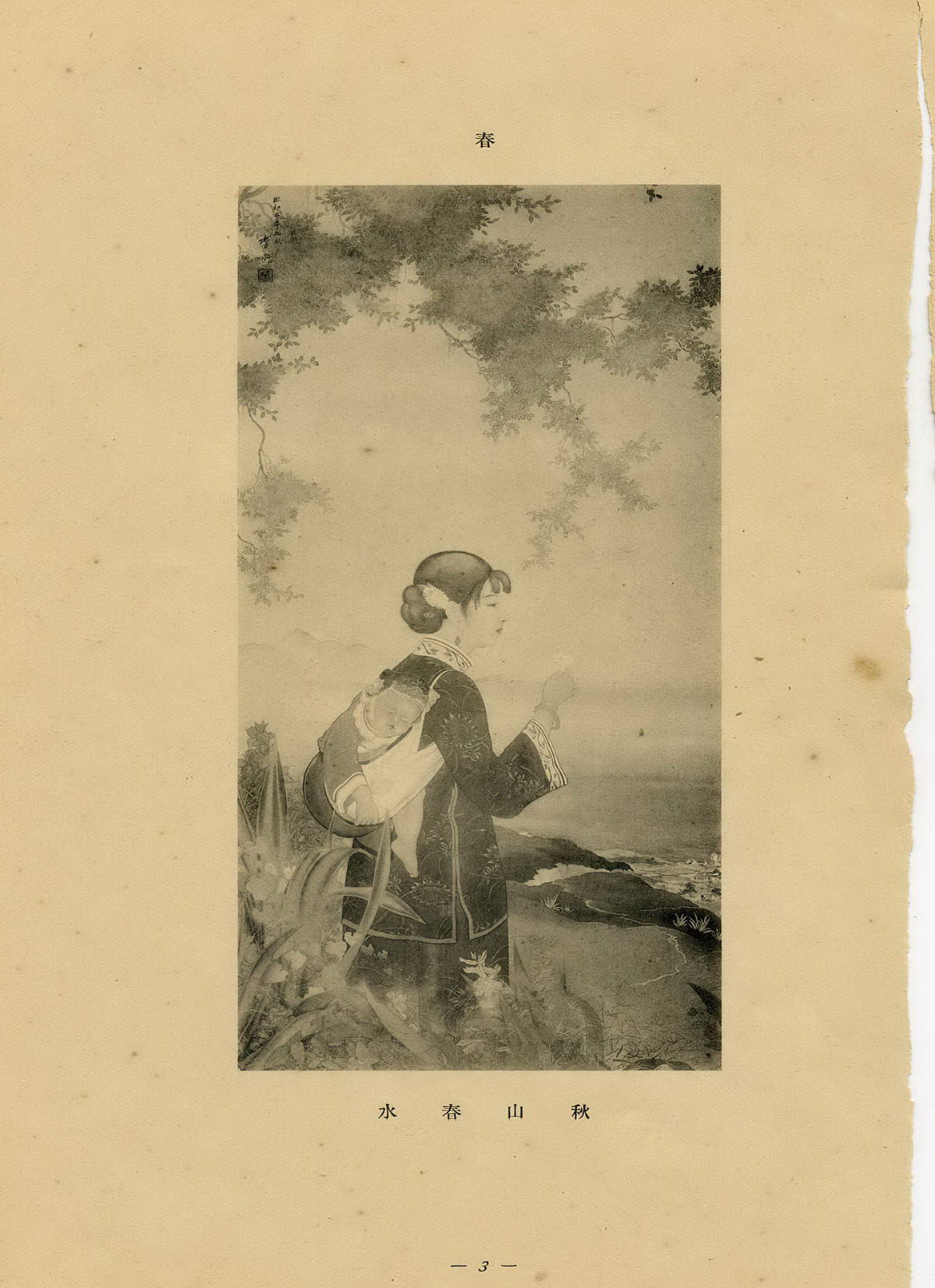 此為秋山春水入選昭和5年(1930)第4回臺展東洋畫部的作品。畫中一位臺灣女子站在山上,四周花團錦簇,草木盛開,而女子背後正揹著入睡的嬰兒,望向右方的大海。畫面左下角可見蜿蜒而下的山中小徑,一路通向海邊的村落。女子神情黯然,手上拿著一朵小花,可能正在思念著遠行的丈夫。畫面的故事性引人聯想,《臺灣日日新報》的N生便指出此畫「描寫的是一位新婚之妻 ,趁丈夫出門工作,爬上村子的後山,眺望著遠處春和日麗的海洋和島嶼,以及自己剛剛才爬上來的北路」。值得一提的是,此畫與野村誠月《妍春》共陳一室,位於《妍春》左邊,因此兩幅作品不免被拿來比較。N生認為此畫比《妍春》為佳「令人覺得新鮮」。時任文教局長杉本良則在《社會事業之友》上發表觀展心得,頗為打趣地表示畫中女子彷彿在瞧著《妍春》裡的和服美人,並認為《春》的風景跟人物「都畫得很好」,像這樣同時觀賞、組合兩幅畫的描述,近似臺日報上國島水馬所畫的「臺日漫畫」。水馬在臺展期間的漫畫連載中,亦會將複數的臺展畫作進行組合跟拼湊並加以詮釋。