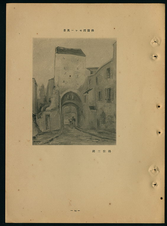 此為楊佐三郎入選昭和8年(1933)第7回臺展西洋畫部的作品。此畫以仰視的視角構圖,描繪法國莫雷鎮(Moret sur Loing)的風景。畫中具有門洞的建築是莫雷橋(Pont de Moret-sur-Loing)畔一處中古世紀的城門建築,至今猶存。畫家完整地紀錄其羅曼式(Romanesque architecture)建築拱門和兩側建築不規則立面的特徵,也表現其上的光影變化。一記者評曰:「楊佐三郎的作品也是在歐洲所作,共發表(略)《法國莫雷風景》。楊君大前年也獲特選,但前年3件作品全部落選,因而發憤圖強,前往法國努力學習1年。今年的作品遂煥然一新。留法以前他的作品往往色調暗沉,現在變得非常明亮,此即變化之一」,認為畫家於留法之後,作品色調由暗沉轉為明亮,為一大改變,對其發憤圖強相當肯定。鷗亭生(大澤貞吉)評曰:「發表《巴黎初春》的楊佐三郎(略)等,(略)因為親身在美術最發達的地方學習過,態度上不像前面努力學習派般充滿幹勁,而顯得有些老油條,寄望他們不要重蹈以往歸朝畫家的失敗覆轍」,認為法國留學回來的畫家不夠努力,態度不如東京美術學校派的畫家積極,兩人的評價竟完全相反,頗為有趣。