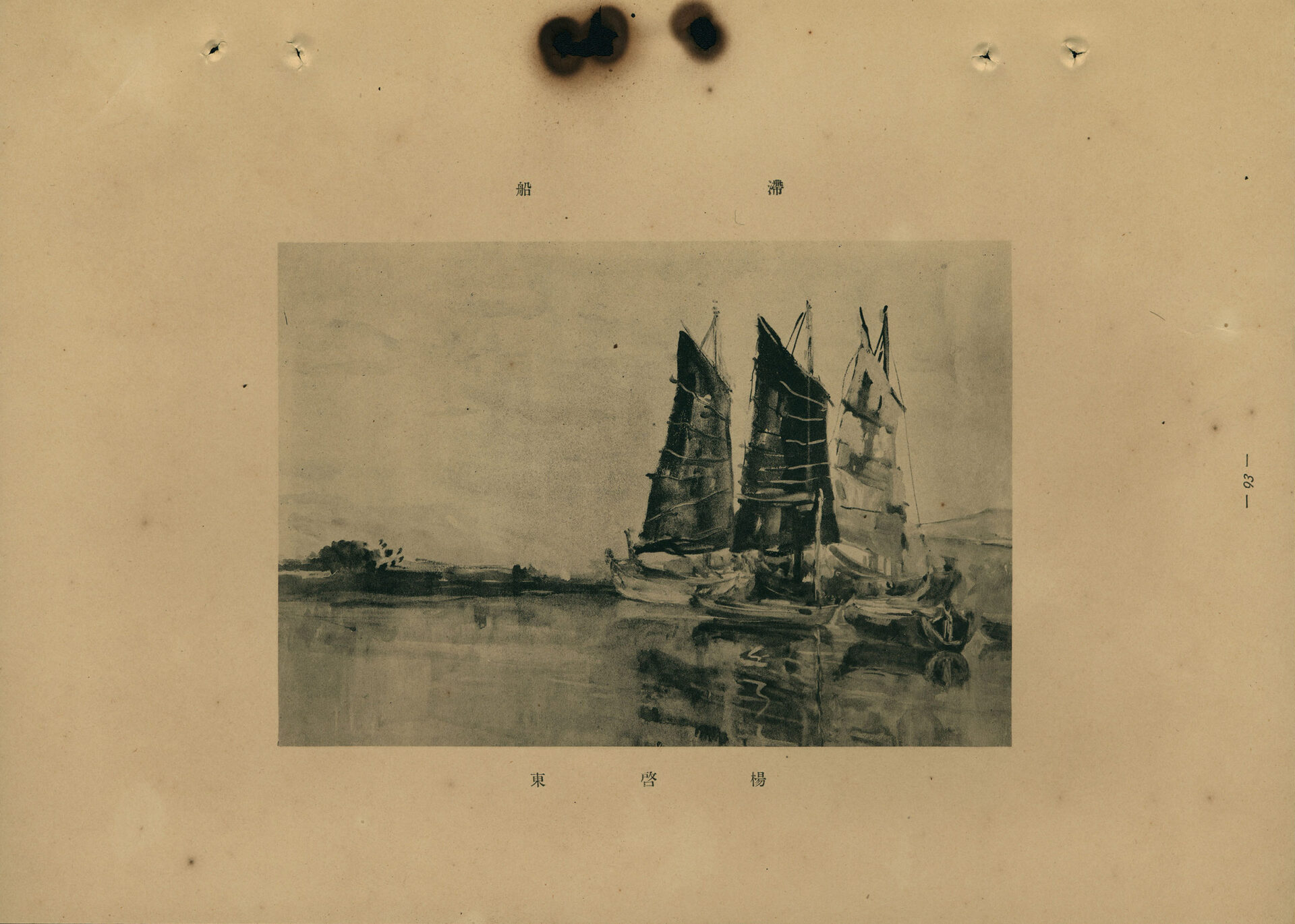 此為楊啓東(楊啟東)入選1928年(昭和3年)第二回臺展西洋畫部的畫作,為一幅筆觸輕盈,描繪停靠在水岸旁的帆船風景畫。畫家以暈染法描繪倒影及帆布,再以不透明顏料勾勒船隻及水下倒影的反光,收畫龍點睛之效。構圖方面,此畫反映楊啓東師承石川欽一郎的道路山水圖式,以壓低的地平線表現遼闊的視覺感受,描繪帆船(戎克船)及汀洲水岸也是石川擅長的主題之一。不過相較石川多以簡化的筆觸描繪船身,楊啟東在此作裡對船體結構的描寫比較精細詳密。同年10月17日刊載在《臺灣日日新報》(7版)的臺展相關報導,其作品名稱上標有「O」印,顯示楊啓東為「新入選」作家。不過該篇報導將畫家名稱誤植為「揚啓東」。