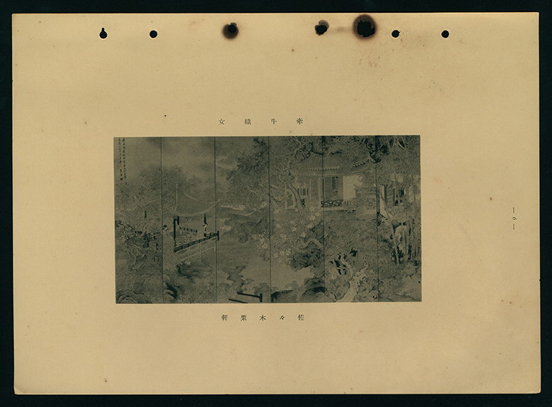 此為佐佐木栗軒入選昭和5年(1930)第4回臺展東洋畫部的作品。為六曲一隻屏風,從畫題可以推知是描寫農曆七夕牛郎織女相會的日子。畫面以一條自左上到右下的河流分隔兩邊,用來代表銀河,而位於畫面下方的小橋則是鵲橋。左邊有一處亭臺水榭,右上角則是一棟華麗的屋宇,周圍風光明媚,宛若天上仙境。亭臺上有三名美人,其中一位自桌前走向臺邊,隔著河水向畫面右處眺望,可知應是織女盼到牛郎。畫面右邊的樹叢間,牛郎手持斗笠,背後牽著一頭牛,望向織女所在的亭臺。兩人隔著銀河與鵲橋,遙遙相望。《臺灣教育》署名Y生者撰文評曰:「有細密的描寫,其努力足以令人表達敬意。」而《臺灣日日新報》署名N生的評論家則進一步指出:「佐佐木栗軒出品的是 《牽牛織女》。這是六曲一雙屏風,為一力作, 但一扇和一扇之間的構圖連續,顯然都不夠用心,例如細小的樹幹突然變粗,或秋天褪色的竹葉,在下一個扇面上突然帶有春色等等,結果導致此畫成為失敗之作」。兩人皆肯定畫家構思及製作頗為費心費力,但N生則進一步點出畫面的諸多缺失,稱其為失敗之作。