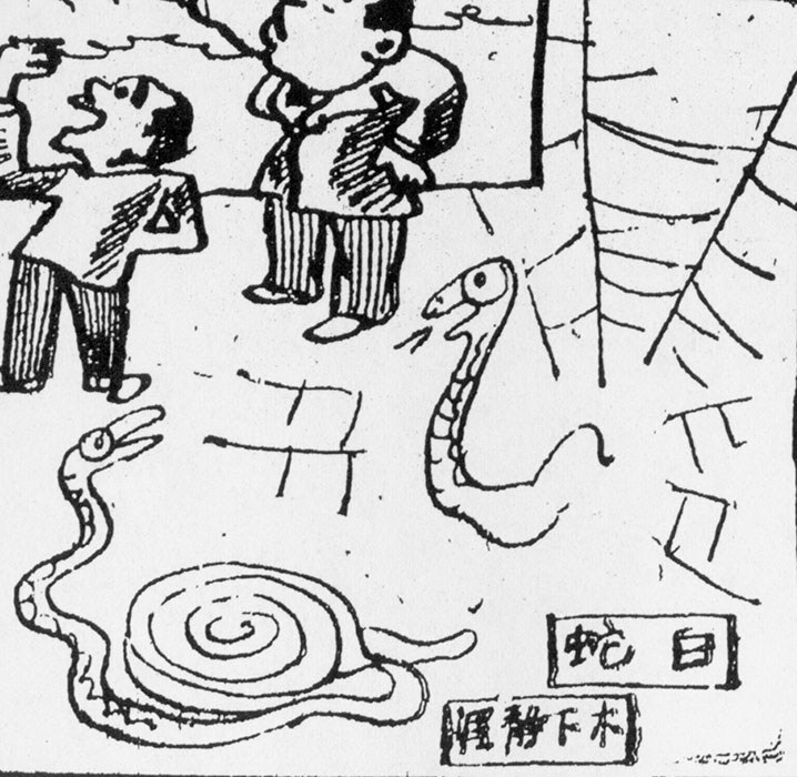 臺灣日日新報設有一個「臺日漫畫」專欄,於臺展期間可見針對入選作品之戲筆,詼諧幽默、令人莞爾,作者多半是該報社的漫畫記者國島水馬。此幅漫畫亦是出自水馬之手,調侃的對象是木下靜涯的《光耀之日》(1931)。原畫為兩曲一雙的屏風,描繪了一對白孔雀,雄鳥開屏,雌鳥伏坐,彼此互相對視;無論是華美的翎毛還是一旁陪襯的枝葉,都展現出畫家極為細緻的寫生能力。水馬在漫畫中,如同其標題「白蛇」,將兩隻孔雀轉化為兩條白蛇,對應雌鳥的蛇蜷曲纏繞著身體,形同孔雀的身形;而對應雄鳥的蛇後方帶有放射狀的線條,應是將開屏的羽毛比喻為整片的蜘蛛網。水馬之所以有如此聯想,或許是因白孔雀襯上了深色的背景而更顯凸出,尖銳的鳥喙配上細長的脖子形同蛇一般的樣貌,而孔雀開屏後展成扇面的羽毛互相交疊,則有如編織縝密的蜘蛛網。藉由不同物件的組合,水馬賦予了原畫不同的觀看角度,也展現出他獨到的眼光與豐沛的想像力。