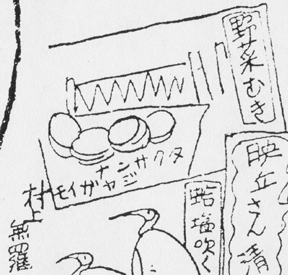 臺灣日日新報設有一個「臺日漫畫」專欄,於臺展期間可見針對入選作品之戲筆,詼諧幽默、令人莞爾,作者多半是該報社的漫畫記者國島水馬。此幅漫畫亦是出自水馬之手,調侃的對象是村上無羅的《暖暖的春日》(1929)。原畫描繪基隆暖暖一帶的景色,群山環繞、溪水川流,一座吊橋橫跨在河流之上,連通兩岸以作為運輸聯絡之用,同時也是殖民權力深入臺灣山野的表徵。如此具備實用性與象徵性的建設,在水馬的漫畫裡則被大幅簡化,除了將橋樑的懸索以鋸齒線條替代,橋下渾圓巨大的岩石也被改為一顆顆球形物體。這則漫畫以「蔬菜削皮」為標題,而球狀物旁邊則寫著「很多馬鈴薯」;水馬乃是將吊橋比喻為削皮刀、河中的石塊想像成馬鈴薯,因而使得原為表現寬廣自然風景的畫作,頓時轉變成廚房流理檯的一角。之所以有這樣的轉化,或許是水馬針對畫家在物象的描繪上不夠寫實所作的揶揄,相當幽默。
