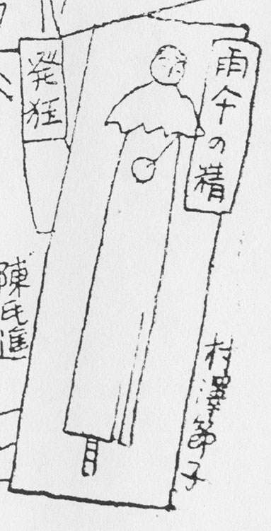 臺灣日日新報設有一個「臺日漫畫」專欄,於臺展期間可見針對入選作品之戲筆,詼諧幽默、令人莞爾,作者多半是該報社的漫畫記者國島水馬。此幅漫畫亦是出自水馬之手,調侃的對象是村澤節子的《妍姿》(1929)。原畫描繪一名身穿大襟衫搭配長裙、腳踩繡花跟鞋的女子,一手拿著團扇、一手撥弄脖子上的項鍊,姿態優雅婉約地站在枝葉前。水馬在漫畫裡,則是以「雨傘精」為標題,將畫中人物的下半身延伸、雙腳改為一根握把,宛如一把收起的雨傘。如此的聯想或許是因原畫裡的女子服裝寬鬆輕柔,從上衣到下著形成曼妙的曲線、拉長了身體比例,因而被水馬比喻為日本的妖怪「唐傘小僧」(からかさ小僧)。有趣的是,雖然漫畫裡的「雨傘精」仍保留人物的頭部,但那把團扇的位置也好比是一顆眼睛,恰巧符合了「唐傘小僧」獨眼的形象。