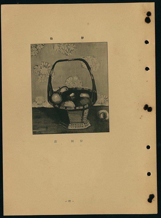 此為岸田清入選昭和9年(1934)第8回臺展西洋畫部的作品。畫中有一八角形的竹編提籃放置在桌上,籃內放有許多水果,右後方亦有一顆落在旁邊,水果狀似蘋果或水梨。後方牆面為菊花紋飾壁紙,畫家以空氣透視法刻意淡化背景的明暗對比,凸顯前景靜物的立體感及陰影強度。此畫當時陳列於西洋畫部第5展覽室,《臺灣日日新報》記者野村幸一觀後撰文評曰:「岸田清的畫,風格類似梅原龍三郎,若不從別人的影子中跳脫出來的話,會很糟糕。畫作本身處理的還不錯」。梅原龍三郎以色彩對比鮮明、富裝飾性的野獸派畫風著稱,此畫現雖缺乏彩色圖版,然能從對比強烈的明暗表現及裝飾性強的背景處理中,仍能觀察到此畫與梅原畫風的相似之處。但岸田是否有意學習梅原的風格,仍有待後續研究。