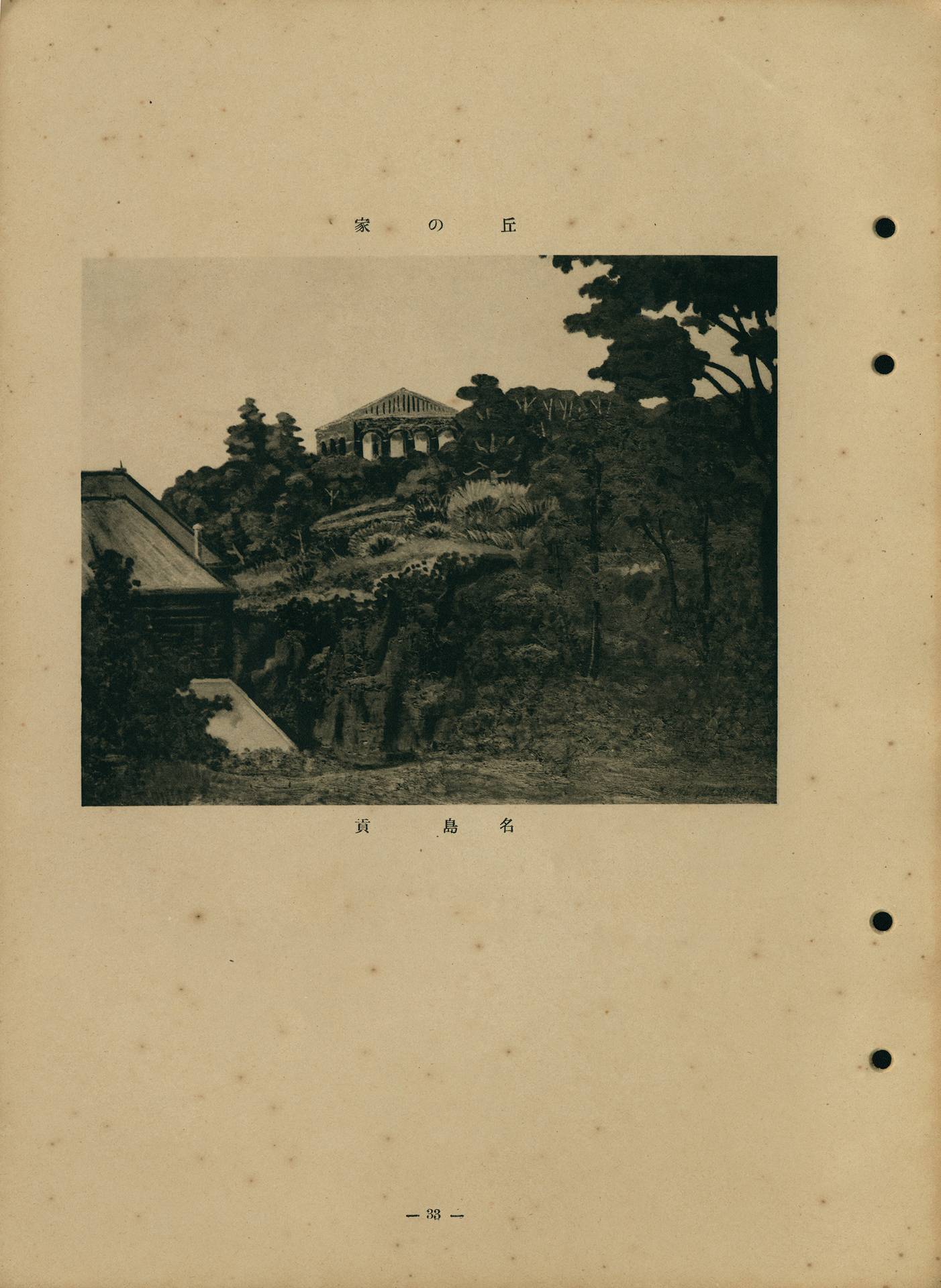 此為1939年(昭和14年)第二回府展西洋畫部名島貢的入選作。畫中描繪樹林密布的山丘上佇立的一棟斜頂洋房,洋房外有拱窗與迴廊,剩下部位被樹叢遮掩。畫面左側下方另有三棟斜頂房屋,同樣僅露出一角,其餘被茂盛樹葉蓋所住。山丘本體佔畫面一半以上,由石壁、土堆與樹林所構成,名島貢運用豐富的筆觸變化處理不同的質感肌理,如描繪山壁與土坡時以乾擦表現斑駁質感,而樹葉則以細密的點筆或線性筆觸描繪。落款位於畫作右下角,但內容模糊,難以判讀。
