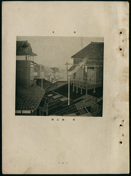 此為林林之助入選昭和16年(1941)第4回府展東洋畫部的畫作。「林林之助」為林之助在皇民化時期的改名。畫家此時就讀於帝國美術學校(今東京武藏野美術大學),學校位於東京世田谷區,畫家便住在此處,以電車通學往返學校及宿舍之間。此畫描繪的是畫家所在的2樓日式住宅所眺望的風景。城鎮間電線桿跟煙囪林立。可以看到畫家為了表現冬天寒冷蕭條的氛圍,以寒色調構成畫面,呈現有別於亞熱帶臺灣不同的色彩表現。近景處可見炊煙從煙囪管緩緩飄出,加上遠處的街道人跡罕至,僅見一兩個人,暗示人們多半在屋內避寒。林之助以理性的幾何形狀構成畫面空間,並用淺色線條勾勒輪廓,細心地將一片片屋瓦,以及牆壁的木板及磚頭用不同明度與、彩度區隔出來,增添畫面的寒暖色調變化。除此之外,畫家也不忘用明暗深淺,拉開遠近景的空間距離。遠處的街道壟罩在淺灰色調中,彷彿正處在冬日暖陽的照射下。此畫為私人藏家所有,媒材是紙本膠彩,尺寸141*147公分。