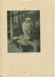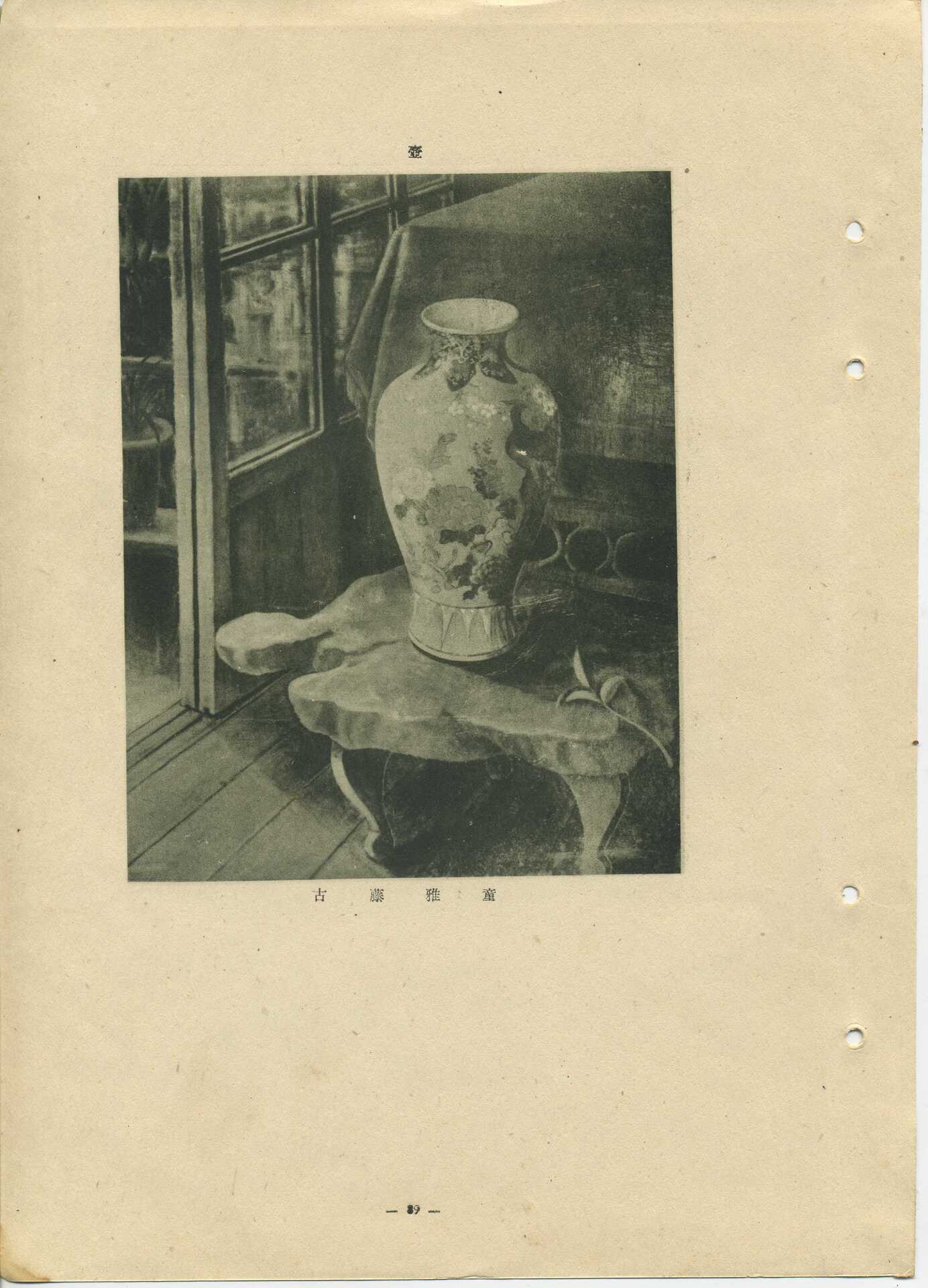 此為 1943 年(昭和 18 年) 第六回府展西洋畫部的古藤雅童入選作。描繪室內的矮桌上,放置著一個古樸的花瓶。花瓶有較短的束頸與圓聳的肩部,腹部由上而下漸漸內收,形制優雅。花瓶上有十分精細的花紋,可大致看到有牡丹花、杏花與孔雀等圖案,帶有富貴吉祥寓意。放置著花瓶的小桌呈不規則狀,可能是原木打造而成,桌緣還有一株點綴畫面的小小枝葉。畫面左方有一扇窗格拉門,通往放有盆栽的室外。光源從左方照入室內,使得畫作右方產生較多陰影。 古藤以細緻寫實的手法繪製靜物,表現華麗古典的瓷瓶,融入在靜謐的家居景色中。畫家不安排靜物畫中常有的鮮花,而是細細刻畫花瓶上的花鳥紋樣,突顯瓷瓶的華美。在右下角放置的枝芽,則為畫作增添了清新的氣息。在官展西洋畫部流行的印象派畫風中,古藤選擇以西洋傳統的寫實手法來表現靜物,顯得別出心裁。