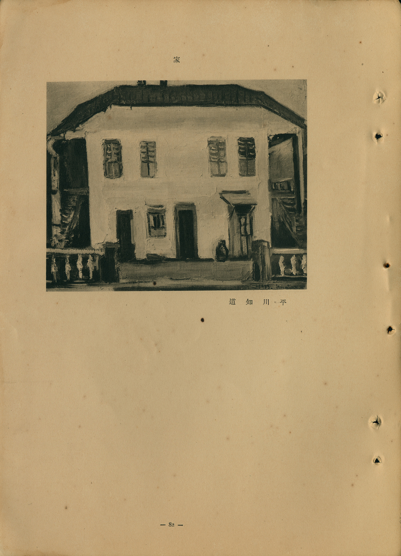 此為1933年(昭和8年)第七回臺展西洋畫部的平川知道入選作。畫面主體是一棟兩層樓的洋房,前庭左右有圍欄,一樓有三個大門,房屋兩側有樓梯通往二樓的迴廊,二樓長方形窗戶設有向左右開闔的窗板,屋頂為梯形頂,頂部可見煙囪。整體筆觸樸實平穩,將房屋的構造及外型如實描寫。值得注意的是,平川知道曾在臺展審查員鹽月桃甫主持的「京町畫塾」接受素描與洋畫的訓練,不過〈家〉的平穩畫風與鹽月活潑的筆觸表現略有不同。落款「1933.H□」位於畫作右下角,推測是平川(Hirakawa)的日語讀音。展覽期間,此作陳列於西洋畫部第七室。