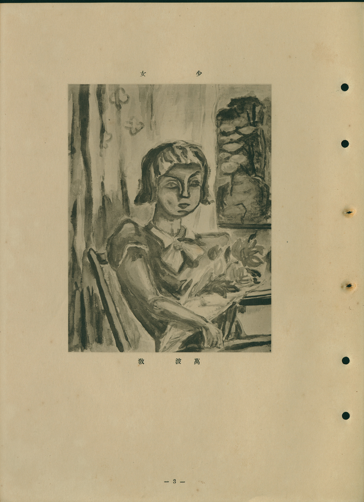 此為1938年(昭和13年)第一回府展西洋畫部萬波教入選作:〈少女〉。畫中一名女子手抱一束鮮花,側身倚靠著背後的椅子,面無表情凝視著畫面右前方。女性頭頂綁有寬髮帶,身著一件西式洋裝,雙肩微微聳起,右手垂放於花束上。畫面左側有一垂落至地面的窗簾,上方帶有些許圖樣,而一旁的窗戶能見外面的風景,應是綠樹繚繞的景色。 萬波教雖使用粗獷的筆觸勾勒五官與身軀,卻仍保有人物與物件的光影變化細節,且畫面整體具有空間感。根據1938年10月19日《臺灣日日新報》(2版)第一回府展的相關報導,萬波教正在臺北帝大國文科就讀,並向記者自述:「我從小學時代便喜歡繪畫,此次展覽的畫作,是以我妹妹みほ子作為模特兒,由鹽月桃甫老師指導」,由此點出此作的指導老師以及模特兒之身分。