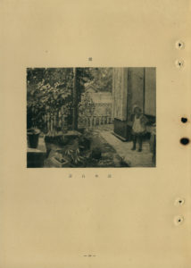 此為高木昌壽入選1929年(昭和4年)第三回臺展西洋畫部的畫作。如畫題所示,此作描繪庭園中擺放各式各樣的盆栽、花草,表現綠意盎然、草木欣欣向榮的景象。畫面右側的簷廊旁,有一人物雙手叉腰,望向畫外觀眾。1929年11月13日《臺灣日日新報》(夕刊2版)的臺展入選報導,標記:「庭 高木昌壽」。1929年12月1日《臺灣教育》第329號〈第三回臺展の盛況〉,標記:「庭 高雄 高木昌壽 非賣品」,除了記錄畫家的住處,也說明畫家無意藉由販售作品獲利。根據總督府職員錄,高木昌壽在1934年任職於高雄州屏東公學校。而鄭水萍在其研究中進一步指出,高木畢業自高雄中學校(今高雄中學)。