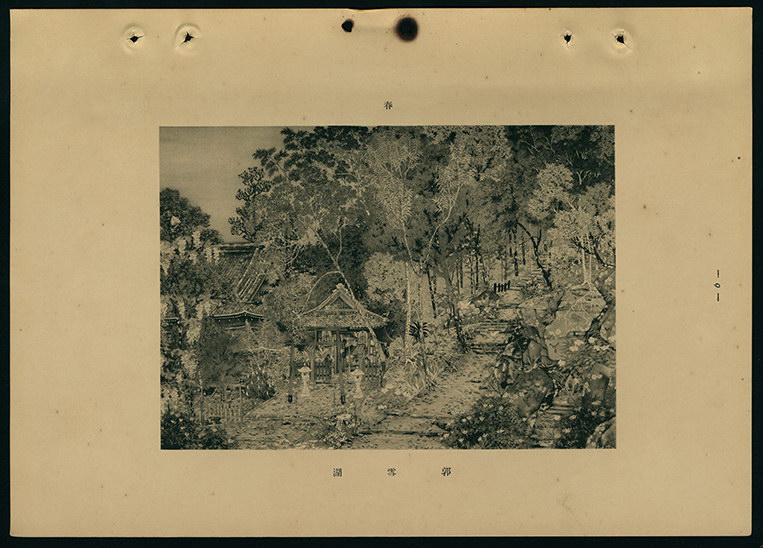此為郭雪湖以無鑑查出品昭和4年(1929)第3回臺展東洋畫部的作品,並榮獲特選。畫面右半邊是一森林小徑,其頂端與右下角各有一尊石造小佛像,小徑間可見有鴿子棲息。左半邊一棟日式寺院建築隱入林間,屋頂為入母屋造樣式,即臺灣俗稱的歇山頂式。畫面中央偏左、小徑旁有一個小神社,其鳥居採明神造,參道旁設有洗手池與石燈籠,根據《臺灣日日新報》的評論,神社的描寫「過於寫實」,這可能與此畫的細密風格有關,例如屋頂下方燈籠依稀可見「豐川」與「稻荷大明」等字樣,指的應是「豐川稻荷大明神」,也就是說,這是從日本愛知縣豐川稻荷分祀的小祠堂。屋脊瓦當兩側有作為稻荷神使者的狐狸的塑像。另外,從周遭地景及神社類型來判斷,此畫應是描繪圓山臨濟護國禪寺後方。左側的寺院建築應是護國禪寺的大雄寶殿。該寺興建於明治33(1900)年,寺院後方確實設有豐川稻荷的祠堂,供奉稻荷神。右邊的小徑應是通往圓山,以此推斷森林小徑的石佛,可能與日治時期臺灣佛教界仿效日本「四國八十八箇所」而興建之「臺北四國八十八所靈場」有關。當時在臺北各處靈場設有小型石造佛像,供信徒巡禮參拜,現在在護國禪寺後山上也仍可看到遺留的石造佛像。