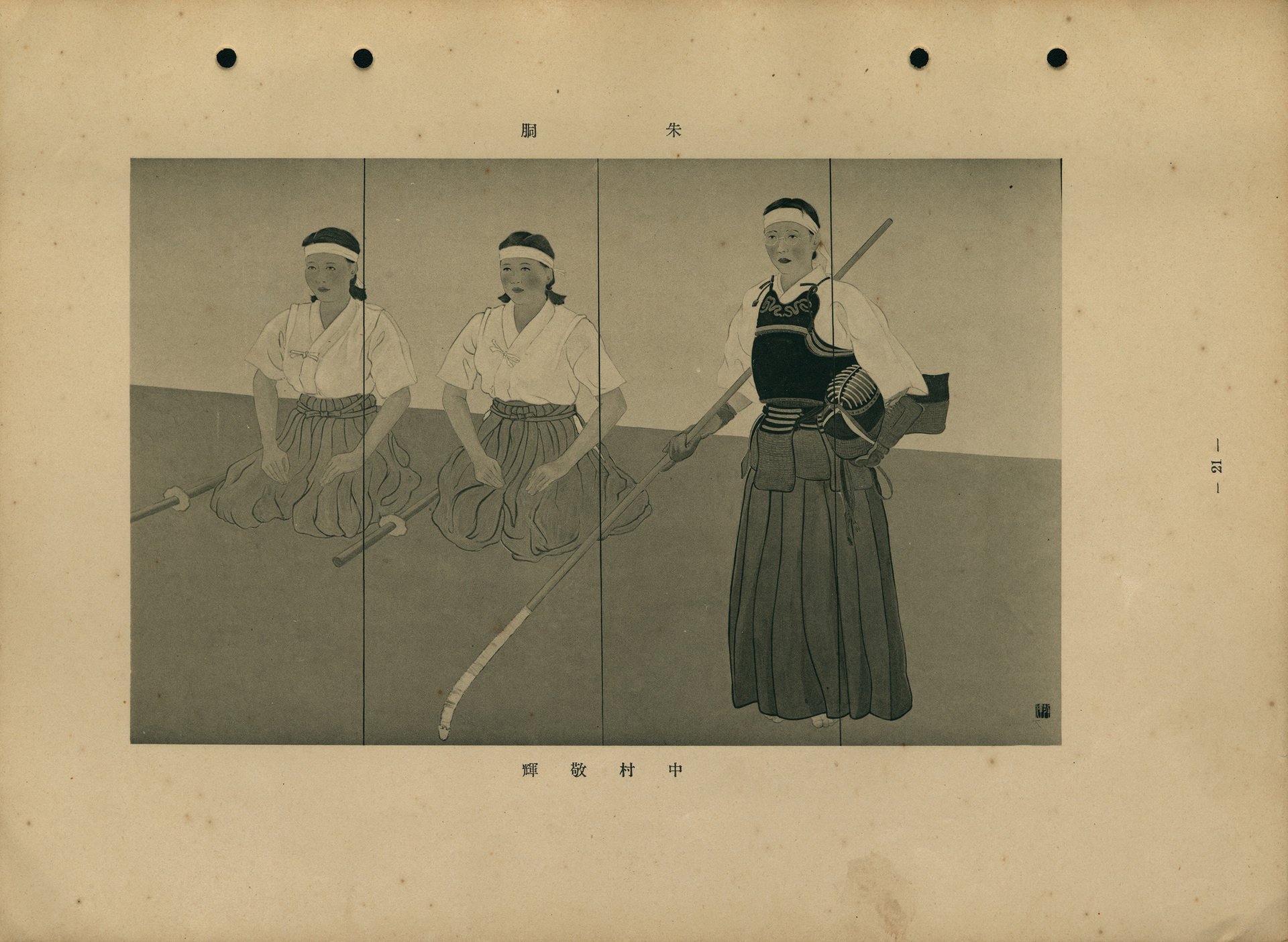 此為中村敬輝(陳敬輝)於1939年(昭和14年)第二回府展東洋畫部的入選作品:〈朱胴〉。在四屏組成的畫面中有三名女性。左側兩名女子呈跪姿,身穿劍道服、頭戴頭巾,身旁放有練習用的木刀;右側呈站姿的女子,身穿護具,一手持薙刀、一手抱著面罩,三名女子的視線均直視前方。陳敬輝準確地掌握人體型態,並以俐落的線條描繪衣著褶皺的變化,在女子下身服裝「袴」的表現上尤為明顯;背景的地板,作者也特意以傾斜的角度描繪,為畫面構出空間深度與延伸感。畫作選擇以劍道訓練為題材,加上對三名女子專注神情的細緻描繪,使整幅作品露出一股正襟嚴肅之感。
