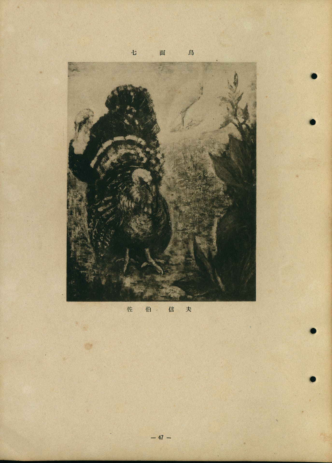 此為 1942 年(昭和 17 年) 第五回府展西洋畫部的佐伯信夫入選作。畫作呈現一公一母兩隻火雞站在畫面中,身旁有植物圍繞。前方的公火雞尾翼展成扇形,正在展示牠華麗的羽毛。畫家清晰畫下火雞頭部的肉瘤、蓬鬆的胸脯和多采多姿的羽毛。畫家並沒有畫出火雞的眼神,但透過牠縮起脖子的動作、粗壯的腳趾,可以感受到火雞雄赳氣昂的氣勢。母火雞站在其身後,身型較小,同樣呈縮脖子的姿勢。牠的羽毛樸素許多,只有脖子以上為淺色。