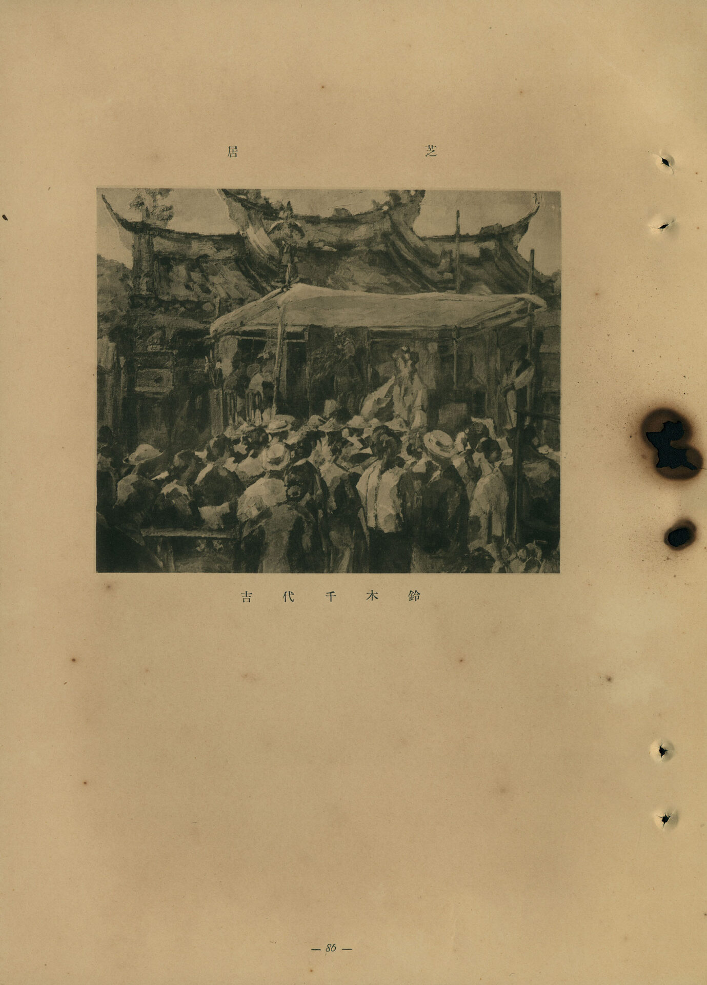 此為鈴木千代吉入選1928年(昭和3年)第二回臺展西洋畫部的畫作。畫題「芝居」可泛指戲劇,此處指的應是在寺廟前舉辦的酬神歌仔戲等演出。畫中人潮聚集在以帆布、竹竿搭建而成的簡陋戲臺前,觀看著臺上戲旦的演出。戲臺背後是寺廟的三川殿,整體色調暗沉以凸顯前景人潮。1928年10月26日《臺灣日日新報》漢文版(4版)的臺展相關報導,將此畫名譯作「觀劇」,評曰:「鈴木千代吉氏之『觀劇』。取材有趣」,應是認為這種描繪臺灣民眾觀看歌仔戲演出的風俗畫作品較為少見,著眼獨特。1928年11月5日《臺灣日日新報》(6版)報導:「臺灣美術展。賣約異常佳績。三日川村總督。購買〈芝居〉。鈴(原文誤植為靜)木千代吉氏作」。可知此畫最後由時任總督川村竹治購買。