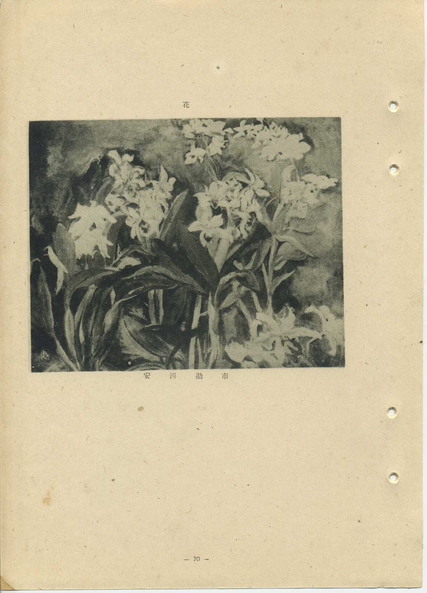 此為 1943 年(昭和 18 年) 第六回府展西洋畫部的安西勘市入選作。畫面左下有一枚方印,內容模糊待考證。根據花朵的特殊唇瓣、較細長的花瓣判斷,畫中的花卉可能是石斛蘭。花朵盛開在莖的頂節部分形成總狀花序,應是夏秋季開花的「秋石斛」。然而除了花形與葉片外,並沒有其他細節描繪,因此無法判斷確切品種。花朵的顏色應為純白色,除了在少數花朵的唇瓣上有些許深色點綴。 畫家並非描繪盆景中嬌貴、經過細心整理的蘭花,而是滿佈畫面、枝繁葉茂的模樣。扁長形的葉片幾乎佔滿了畫作下半部,長勢繁雜,一株株花葉之間分不清條理。花朵之間的輪廓亦不明顯,一叢叢蘭花呈正、側、低首等各種姿態。 石斛蘭普遍喜好溫暖的環境,臺灣也有約二十種原生的石斛蘭,且十分適合種植。安西以豪邁的筆觸與不刻意安排的構圖,表現在熱帶之中恣意生長的蘭花,繪製出帶有臺灣地域特色及自然風格的作品。