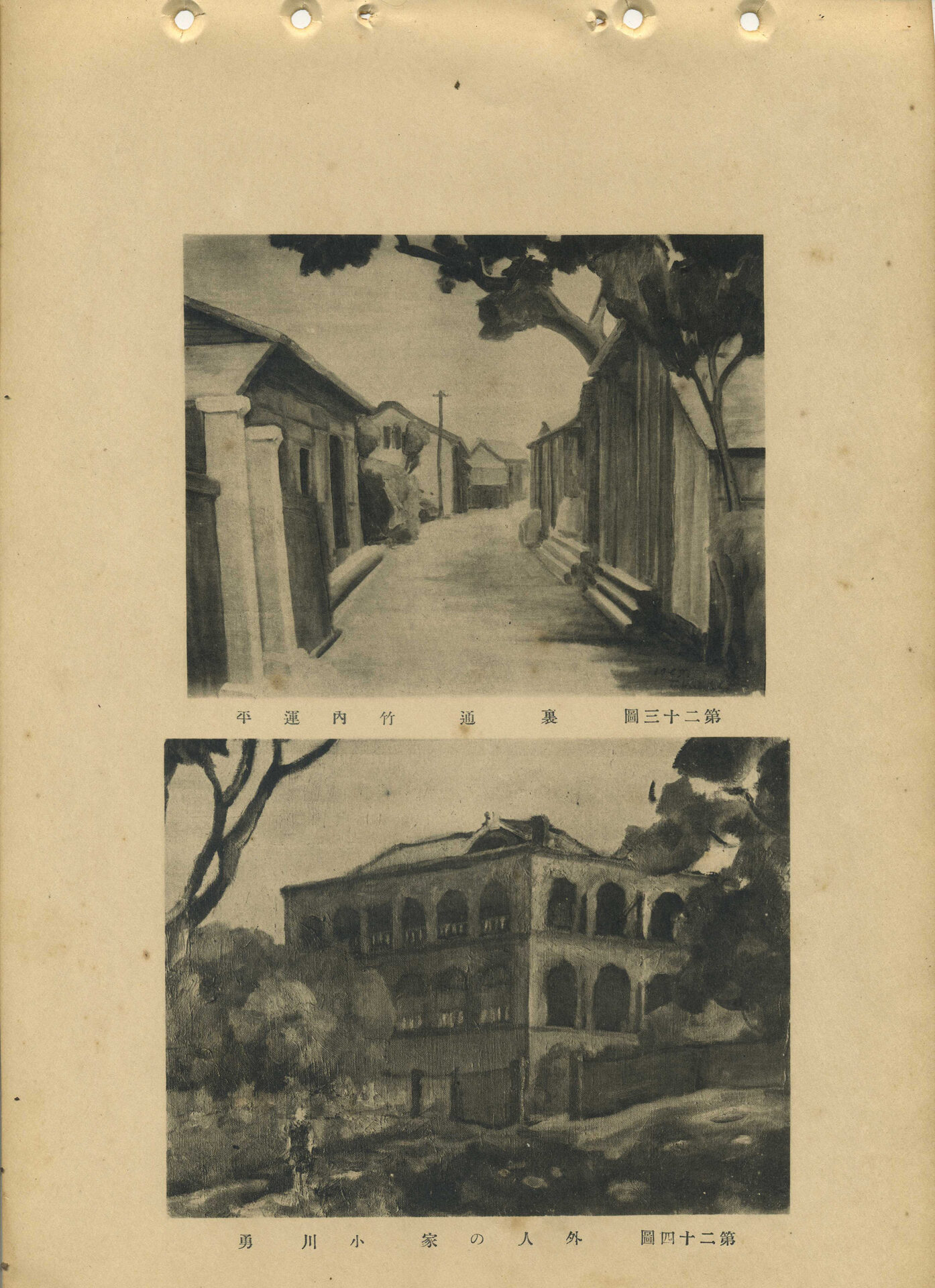 第二十三圖為竹內軍平入選1927年(昭和2年)第一回臺展西洋畫部的作品。圖錄及目錄皆誤植為「竹內運平」,然比對主辦方「臺灣教育會」的機關誌,1927年11月《臺灣教育》第303期刊載的臺展目錄,以及1927年12月西岡塘翠發表於《臺灣時報》的臺展相關評論,即可知道其名為竹內軍平。「裏通り」指的是後街、後巷,竹內長年在師範學校附屬小學校(今臺北教育大學附設實驗國小)任教,距離其所居住的龍口町不遠。這一帶有別熱鬧繁華的城內商圈及大稻埕、萬華,屬於文教區,校舍林立,因此比較安靜適住,如同畫中呈現的景況:靜謐的街道,兩側房舍多為建有庭院圍牆的民宅。此畫大致上線條及筆觸平整,不過右側庭內樹木的枝幹伸出牆外,則略為打破畫面構圖的規律感。右下角有畫家落款,字跡隱沒在陰影內難以辨識,依稀可辨「1927 Takeuchi」,也就是作者竹內(Takeuchi)。此畫在當時陳列於西洋畫部第1展覽室。1927年12月《臺灣時報》的臺展相關評論,西岡塘翠指出:「竹內軍平的〈裏通〉,沒什麼缺點之作」。像這樣簡短的評論或也顯示,西岡認為此畫沒什麼值得大說特說之處。