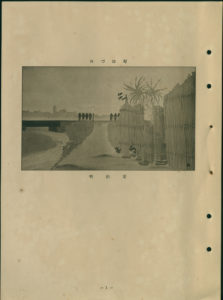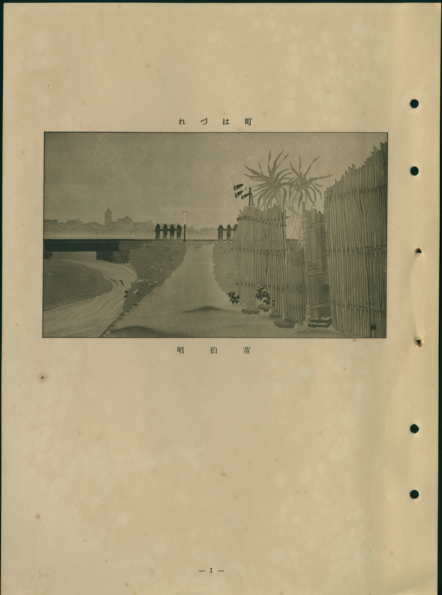 此為董伯昭於1938年(昭和13年)第一回府展東洋畫部的入選作品:〈町はづれ〉。〈町はづれ〉中譯為〈郊外〉。作者以明顯的地平線將畫面分成上下兩部分,下半部的中間有一條略為起伏的道路,右方有樹枝、木板構成的圍籬,左方有蜿蜒的溪流和長著淺色小花的草地。畫面的上半部則是朦朧的建築群,在一片低矮的民宅中,總督府高聳的尖塔顯得特別突出。畫家以細密的筆法描繪圍籬中的林投樹、掛著布條的路燈、告示牌等,將畫面上下半部巧妙的連接起來,使構圖不至於顯得呆板突兀。畫作右下角有一枚方印,印章內容模糊待考。