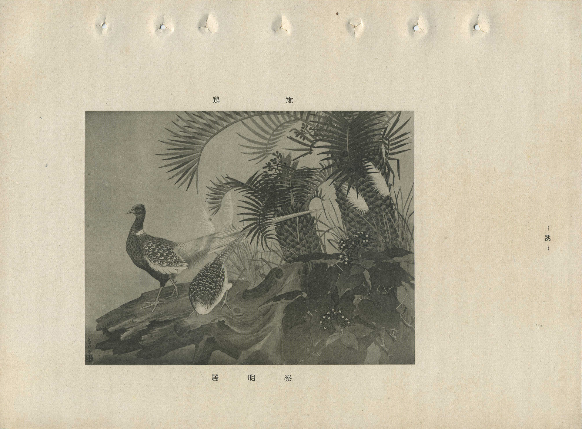 不同種類的植物佔據了畫面右側,一節殘斷的枯木橫陳於下方,兩隻雉雞立於之上。有著長尾羽的雄鳥目光炯炯凝視左方,雌鳥則以俯身姿態面向前方,彷彿將走出畫幅之外。作者以極其細膩的寫實手法,勾勒出各色植物的型態:盾形的葉片、球型花苞、蘇鐵鱗狀莖幹與捲曲的羽狀葉片、芒科植物細長的花穗等。此外,雉雞羽翼特徵與身形的描繪細緻入微,足見作者對鳥類形體掌握的功力。構圖安排上,左側的雉雞與畫面右側茂密的植物,為畫面帶來動靜之間的對比。對於細節的寫實刻畫以及繁而不亂的構圖,再再體現作者對於繪畫技巧的熟捻與優異的造型能力。