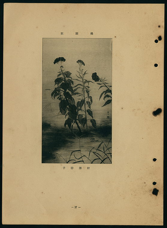 此為村澤節子入選昭和11年(1936)第10回臺展東洋畫部的畫作。雞頭花即是雞冠花,因狀似雞冠而得名,原產印度,廣布於溫暖地區,在臺灣的主要產地為彰化、嘉義、高屏等地區。在臺府展中,以雞冠花為題的作品為數不少,可見雞冠花亦是表現地方色彩(local color)的題材。此畫描繪兩株雞冠花昂首挺立,右側另有一株自畫面外向此二株傾斜倚靠,姿態及色彩各異。畫家以深色點狀用筆表現土壤及泥沙的顆粒,但似乎並未將色彩塞滿畫面下半部,而是有所留白。右下角的留白處以及雞冠花的後面,皆可見牛筋草肆意生長。落款「節子」位於畫面右側,並有一方形「節子」鈐印。此畫當時陳列在東洋畫部第3展覽室。大高文濤在《臺灣日日新報》撰文評曰:「留白下方的處理,佳。因寫生率直,才入選的吧」。牛筋草是在野外常見的野草,畫家將牛筋草安排在雞冠花四周,增添畫中的生氣。