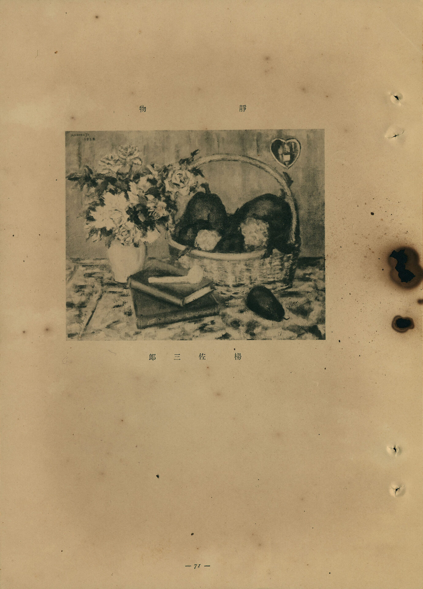 此為楊佐三郎入選1928年(昭和3年)第二回臺展西洋畫部的畫作,畫面構成以瓶花、書本、鮮果、菸斗及竹籃為主。畫家以平穩的方形構圖,將靜物妥洽安排在畫面各處。落款「SASABURO.yo 1928」位於畫面的左上角,此為楊佐三郎的日文讀音。1928年10月26日《臺灣日日新報》漢文版(4版)所刊載的展覽相關報導指出:「楊佐三郎之〈靜物〉。亦彌臻佳境」。此句主要是呼應該報導首段所提到的「西洋畫。一言以蔽之。亦與東洋畫同。全體顯示進境」,認為此回臺展的整體水準皆有所提升。
