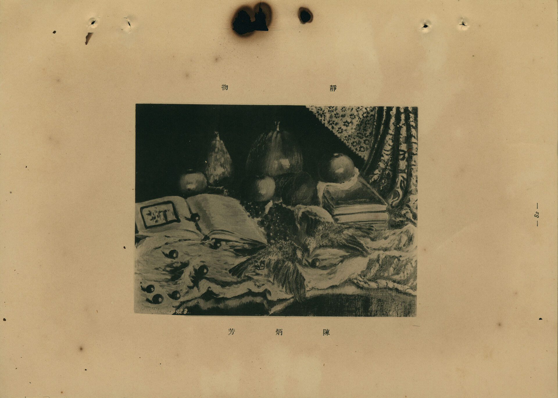 此為陳炳芳入選1928年(昭和3年)第二回臺展西洋畫部的畫作,是由葡萄、蘋果等蔬果,與布幔、書本、剝製鳥類標本等物品組成的靜物畫。畫內靜物數量及種類皆多,搭配花紋細密華麗的襯布,構成繁複的畫面。位在畫面中央的鳥類標本格外顯眼,也是此作與其他靜物畫在取材上有所不同之處。同為臺北師範學校出身的陳澄波,亦曾以類似的鳥類標本創作靜物畫。落款位於畫面左下角,依稀可辨「CHIN......1928」等字樣。其中「CHIN」為「陳」的日文讀音。根據當時《臺灣日日新報》的報導,陳炳芳為首次入選臺展。