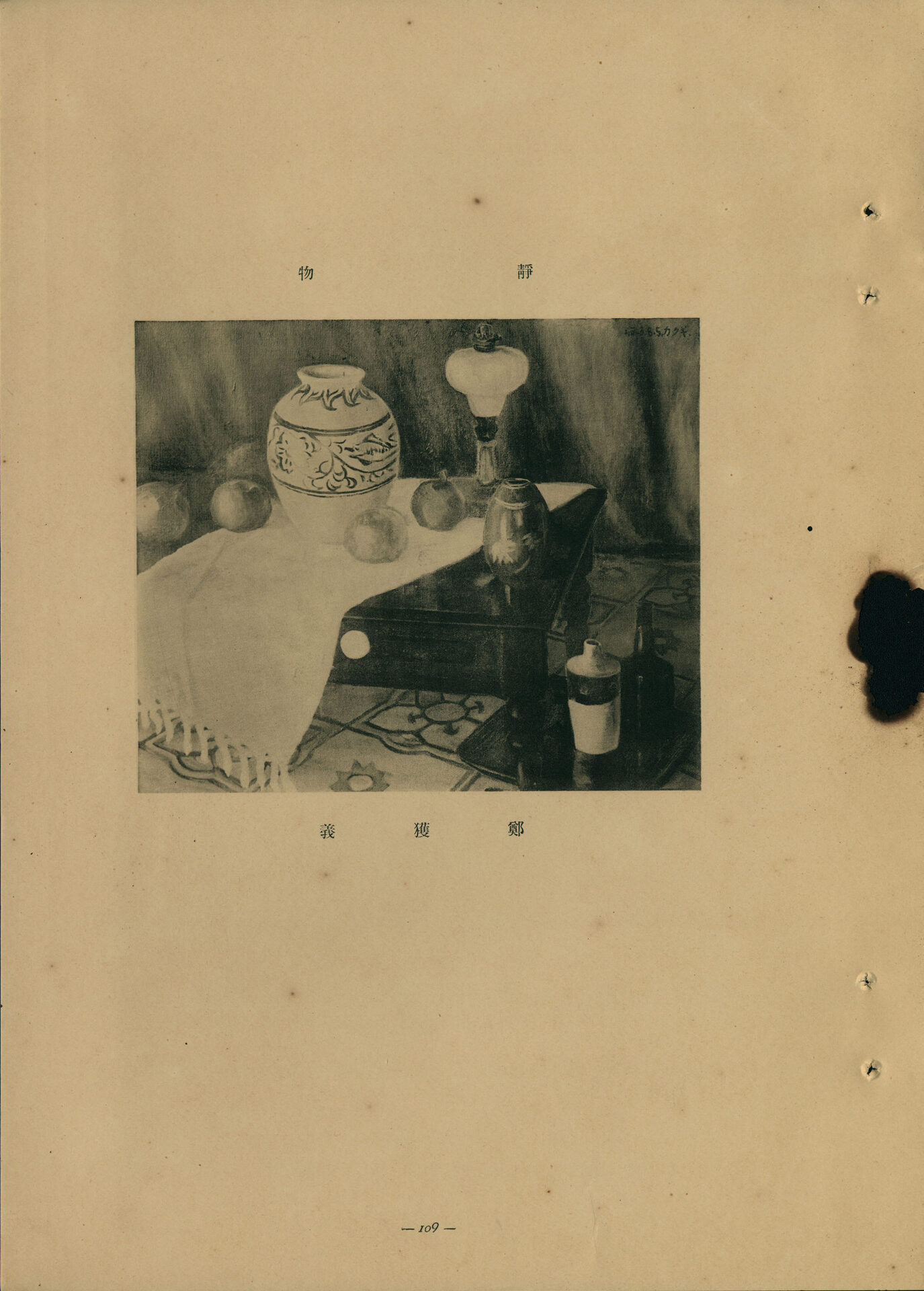 此為鄭獲義入選1928年(昭和3年)第二回臺展西洋畫部的畫作,畫面几案上擺滿水果、桌巾及附有紋飾的大酒罐等物品,地板則由造形簡約雅致的花磚組成。桌腳旁放有一餐盤,盤上放有兩個造型各異的瓶罐,具有打破畫面右下角暗面色塊的構圖功能。落款「1囗囗囗8.5,カクギ.」位於畫面右上角,創作年代難以判讀,「カクギ」應是「獲義」的日語讀音。1928年10月17日刊載在《臺灣日日新報》(7版)的臺展相關報導,顯示鄭獲義為「新入選」作家。鄭獲義任教於高雄第三公學校,且為高雄美術團體-白日畫會成員。翻閱《高雄現代美術誌》(2004),刊有1928年11月高雄白日畫會展覽合影,照片中後排左三者為鄭獲義,而《靜物》就陳列於後方右側牆上,推測此畫在臺展結束後,被移至白日畫會展場進行展覽。