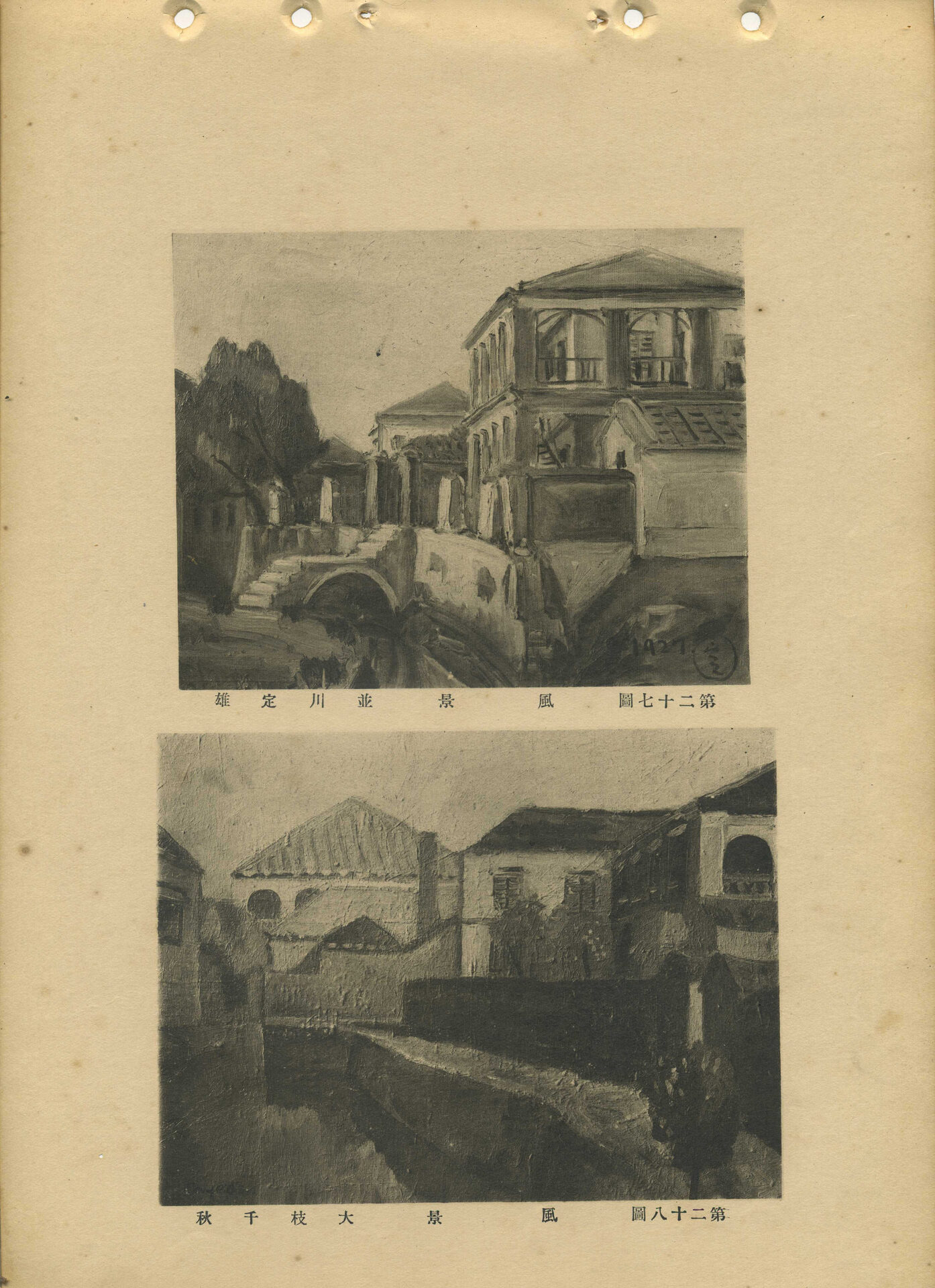 第二十八圖為大枝千秋入選1927年(昭和2年)第一回臺展西洋畫部的作品。此畫與並川定雄〈風景〉(1927)的構圖相似,前景皆有水道流過,右側以圍牆為分界,內有兩層樓的洋樓建築群。水道在畫面盡頭向左拐彎,後方另有一棟淺色牆面、斜面屋頂的洋樓。《第一回臺灣美術展覽會圖錄》(1928)的目錄,刊載大枝住址:「臺北市下奎府町3之2」,位於大稻埕商圈內。畫面左後方淺色牆面建築,其屋頂特徵及拱頂迴廊的造型,特徵上近似大稻埕李春生洋樓(今歸綏街與環河北路一帶)。另外,根據1927年10月27日《臺灣日日新報》(夕刊1版)的臺展相關報導,大枝為臺北高等學校一年級生。由此推測大枝在校期間應師事該校圖畫教師鹽月桃甫。不過觀察畫面表現,此作構圖更近似石川欽一郎所擅長的道路風景構圖,而非鹽月的野獸派風格。