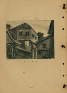 此為1934年(昭和9年)第八回臺展西洋畫部的花本義高入選作,這位在大龍峒公學校(今大龍國小)任教的畫家,1933年第七回臺展時,曾以「花本義孝」之名入選,或為誤植。此作依然延續去年的房屋主題進行創作,描繪巷弄間的兩層樓房舍,建築二樓有打開的窗戶,屋頂為斜頂。花本以仰角視角描繪中央建築,抬升其畫面中的高度,而錯落在旁的樹叢與矮房則有烘托主體的功用。不同於大多數成是畫家習慣描繪房屋的屋頂,花本反而描寫屋簷內側的結構與曲線變化。這種視覺經驗,或許反映他在大稻埕、大龍峒一帶的生活。落款位於畫作右下角,但內容難以判讀。根據1934年11月《臺灣教育》第388期刊載的臺展入選目錄,展覽期間此作陳列於西洋畫部第六室。