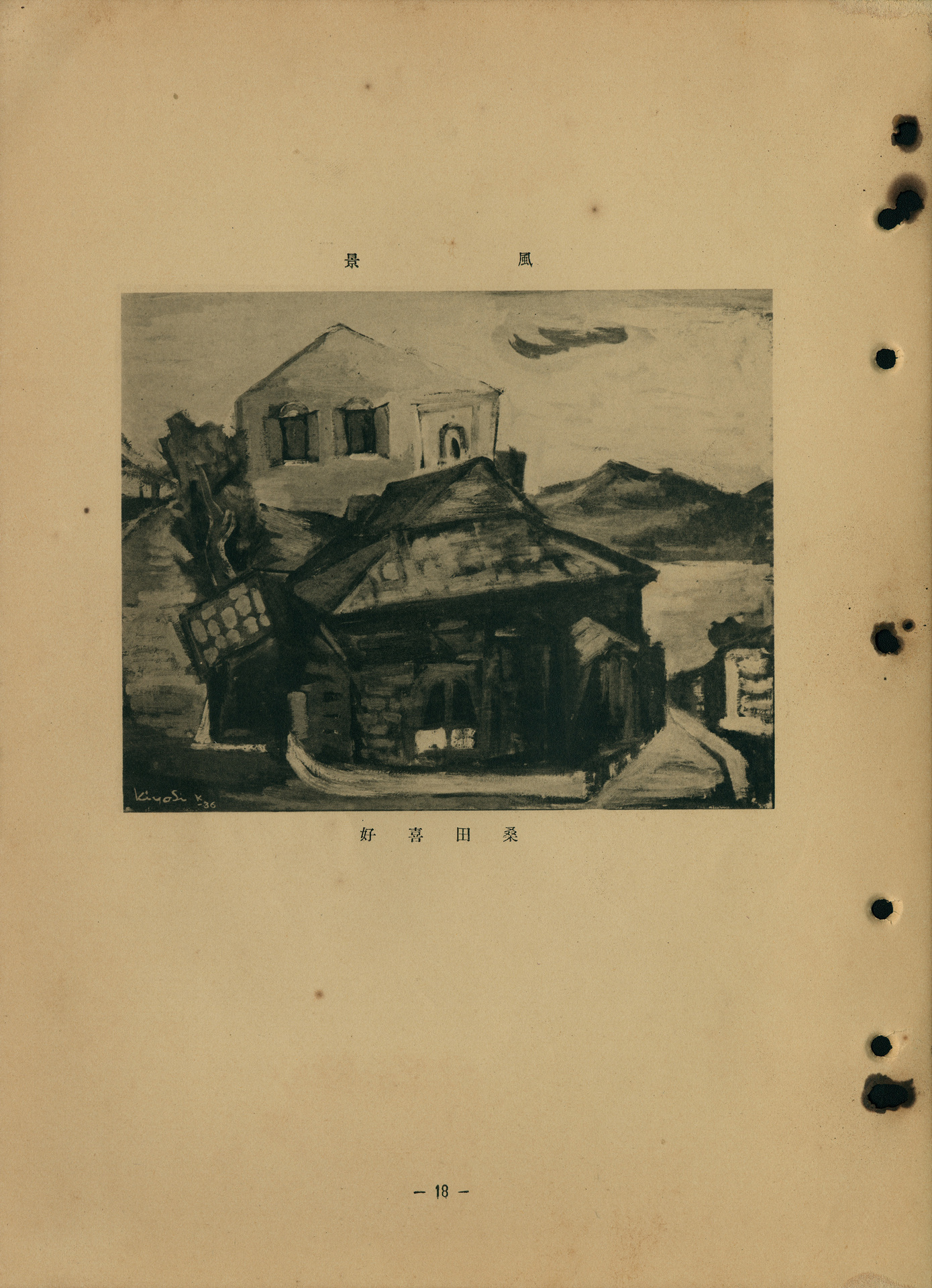此為1936年(昭和11年)第十回臺展西洋畫部桑田喜好的入選作。畫家以俐落而狂放的筆觸,描繪建造在某處山坡道路間的房舍。畫面前方的房屋是常見的斜頂磚造矮房,外觀老舊,屋頂微微向左傾斜。畫面後方的淺色建築為西式洋樓外觀,有斜頂及類似拱廊的結構,兩扇窗戶為半圓形頂部,附有向外打開的窗板。畫中的道路自左側高處,向右側下方緩緩下坡,帶領觀眾的視線通往畫面右側後方的河流與遠山,山形以簡約的色塊構成。畫面整體明暗對比強烈,考慮到天空晴朗無雲,可以推測強烈的明暗差,是因為太陽照射導致。落款「Kiyosi K-36」位於畫作左下角,為「喜好 桑田(Kuwata)」的日語讀音縮寫。