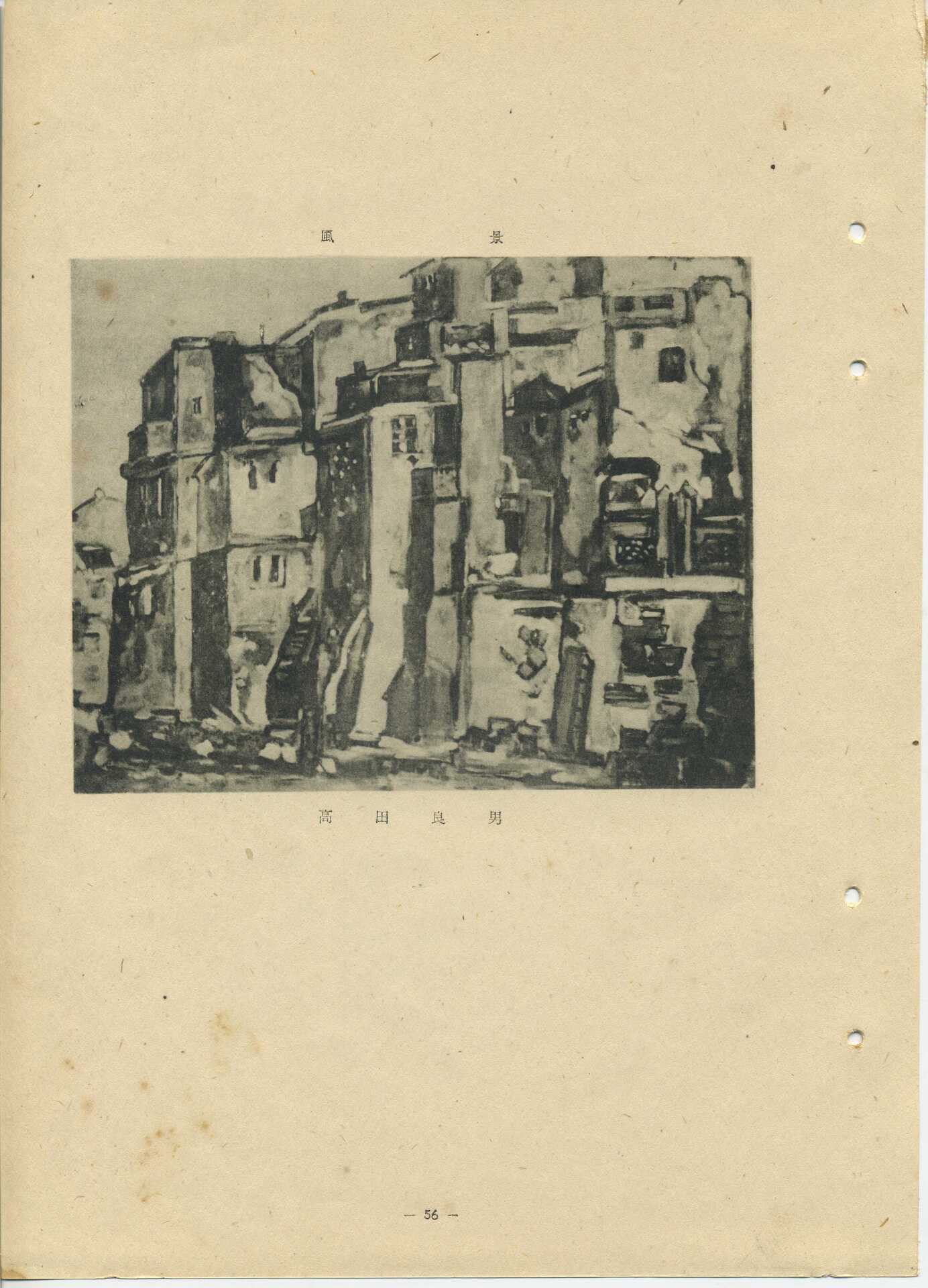 此為1943年(昭和18年) 第六回府展西洋畫部高田良男的入選作:〈風景〉。 櫛比鱗次的建築,彼此緊密相連,如陡峭的懸崖般聳立。建築的牆面斑駁,有的窗戶狹窄,有的以小方格排列而成,厚重的牆面與狹小的窗戶形成反差。建築群幾乎佔據整個畫面,僅留下前景一小塊空地和左上角一小塊天空,壓迫著觀眾。 前景堆放了一堆物品,不易分辨細節,顯得雜亂。部分建築表面出現深刻的裂痕,建築材料裸露,凸顯蕭瑟陳舊的氛圍。地面樓層可見連接上層的條狀結構,可能是樓梯,十分狹窄,不易攀登,更是給予觀眾環境惡劣的印象。畫作描繪的,應是戰爭期間,建築受戰火破壞,雜亂如廢墟的狀態。