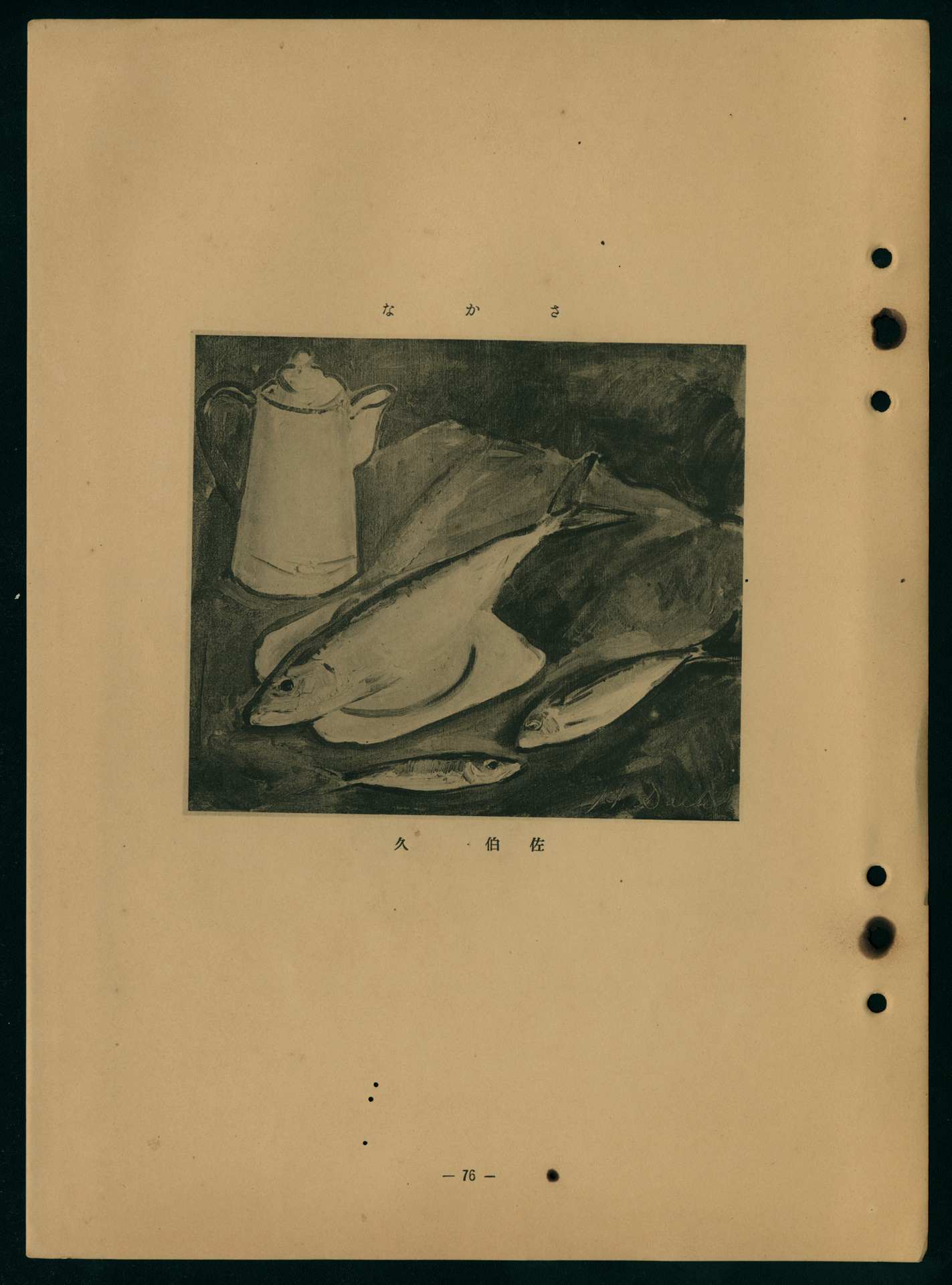 此為1935年(昭和10年)第九回臺展西洋畫部佐伯久的無鑑查(免審查)資格出品作,畫作題名「さかな」可以寫作「魚」。畫家描繪放於桌上的魚隻、盤子及水壺,魚隻修長及紡錘形的體型,以及叉型尾鰭,讓人聯想到鯖魚(青花魚)、馬加魚等魚類。其中兩隻較大的魚被斜放於畫面中,與桌子方向平行,呈現線條排列的趣味。水壺有附耳、蓋、注口,從光滑且高明度的壺身推測是金屬材質。值得注意的是,佐伯久以流暢的輪廓線勾勒水壺與魚身,以粗細有致的線條表現物體的厚度與陰影等細節,可以窺見類似於後期印象派的簡化手法,帶有俐落而明快的風格。 畫作右下角署有落款「H.Saiki」,應是佐伯久(Saiki Hisashi)的日語讀音縮寫。售價方面,根據《第九回臺灣美術展覽會目錄》,標記〈さかな〉為100圓。