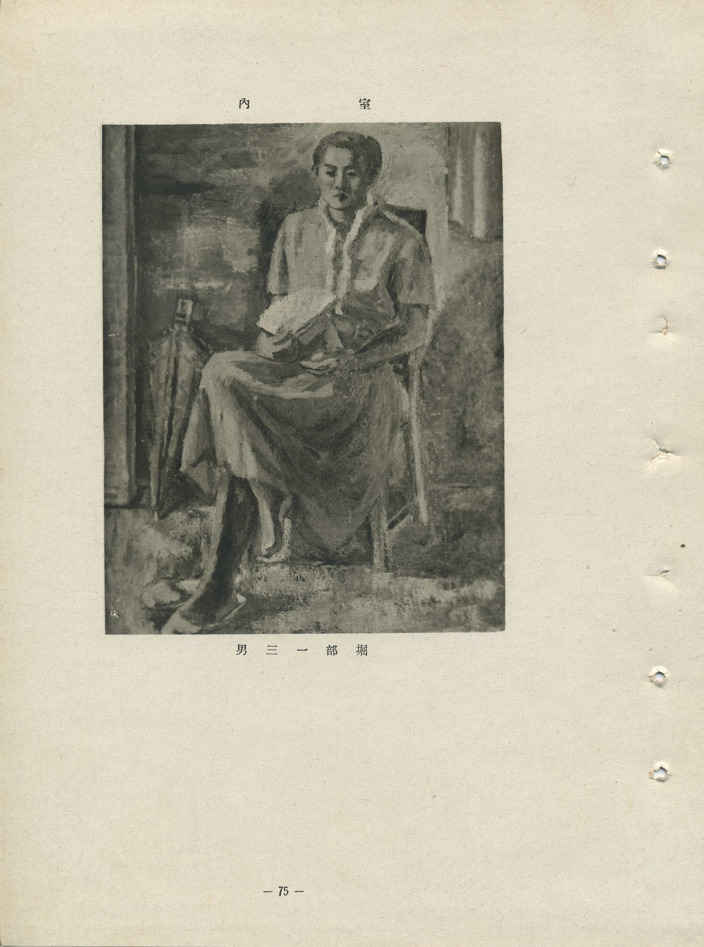 此為堀部一三男入選1940(昭和15年)第三回府展西洋畫部作品。畫中一名女子優雅的坐在木製椅子上,光線從左上方投射在女子身上,女子身穿胸前荷葉折邊立領的長洋裝,右手持扇,雙手擱在大腿上,右腳赤足跨在左腿上,左腳微向她的右前方伸展。在她的右後方放置了一把洋傘,傘邊敞開的門讓自然光照射到室內。從女子的打扮來看,能推測出是富裕家庭的小姐,照進室內的光線投射在畫面前景地板上,右方除了露出一角的窗簾,牆面似空無一物。府展時期,堀部作品的構圖越來越簡潔,如第二回府展〈花のある室〉跟這幅〈室內〉,都聚焦人物肖像。較之1929年第三回臺展〈洗濯〉、第六回臺展〈溫煦〉(特選)的繁複背景構圖相差甚遠。歷屆臺府展中,許多作品也出現過類似的主題,如顏水龍第三回臺展的〈椅子二モタレル裸女〉、李石樵第九回臺展〈閨房〉、松ヶ崎亞旗第二回府展特選的〈室內〉及入選第三回府展另一畫家鄭安的〈室內〉等,都是描繪女人跨坐的肖像。