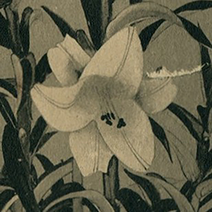 文化的面向上,鐵砲型百合鮮明的白色花朵猶如代言臺灣的符碼,雜誌《萬壽果》曾刊登一篇以淡水河周遭為故事背景的創作小說,小說題名即「高砂盛開的白百合(高砂に咲いた白百合)」。服部衣山人描述臺灣風景的詩作〈夏雲奇峰〉則用「高砂百合」與竹床、鳳凰木、月下美人、椰子等,營造臺灣的初夏意象。(註13)盛康見證鐵砲型百合栽培方法的確立與普及,在上述的時代氣氛中畫出他的〈百合花〉。