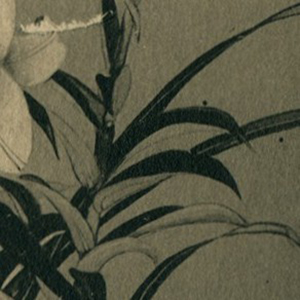 〈百合花〉的畫面清新淡雅,大面積的留白將畫軸下方茂盛的百合花叢襯托得越加明晰,右上疏朗的空氣中點綴了隻蝴蝶。畫作如實勾勒百合在植物學上的形態特徵,不只畫它的六片花被,還畫百合花被的二重構造:內外各三瓣,由花萼演變而來的外花被,稍顯狹幅(圖3)。(註5)此外,〈百合花〉亦繪出葉的互生關係,以及葉片表面的平行脈(圖4)。對比1934年顏水龍的臺展出品作〈姬百合〉(圖5),盛康對植物形態細節的處理,顯得相當考究。