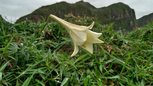 1929年農學專業出身、時任臺北第二師範學校教諭的加藤謙一(生卒年待考)出版《臺灣花卉園藝(臺灣に於ける花卉園藝)》,將百合粗分作山百合、鹿子百合、透百合、姬百合、笹百合、鐵砲百合。(註6)而盛康筆下的百合,花色白淨、作長筒狀喇叭形,更似加藤所謂鐵砲百合。由當代的角度觀之,畫中百合大約屬於以開白花為特點的鐵砲型百合品種群。臺灣常見的鐵砲型百合有高砂百合(即臺灣百合,Lilium formosanum)(圖6)及鐵砲百合(即麝香百合,Lilium longiflorum)(圖7),皆為臺灣原生種。由於兩者親緣相近,且高砂百合的形態隨環境高度變異,極不易借外觀區辨,故本文暫不做確切的物種推定。(註7)但我們仍大致知道,盛康畫的是鐵砲型百合,即臺灣原生的高砂百合或鐵砲百合。