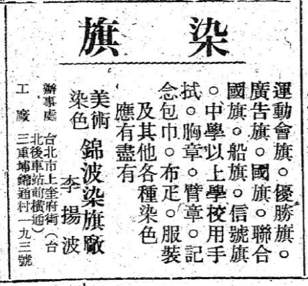 從上述分析可知,李揚波的創作與工作之間有著密切關係。不僅如此,他在戰後持續染料事業的發展,並且逐漸成為臺灣染料工業的佼佼者。1946年10月17日《民報》刊登一則廣告(圖10),標題名為「美術染色 錦波染旗廠 李揚波」,服務項目包含「運動會旗、優勝旗、廣告旗、國旗、聯合國旗」各種產品染色,並且留下聯絡地址,其中工廠位於「三重埔錦通村一九三號」。(註6)