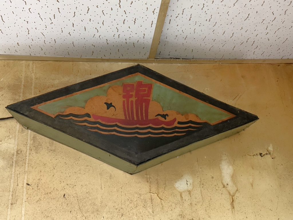 李揚波開創的事業薪火不滅,歷經幾次的搬遷,時至今日走在臺北市大同區,依然能夠看見「錦波染料行」的招牌。店內懸掛著一盞燈箱,正面為李揚波親自設計的商標(圖11)。風帆造型的錦字,取自妻子賴錦秀的名字(註13),揚帆航行於海波之間,白雲與海鷗隨行,活潑而富有趣味性。